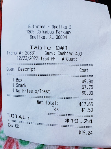 Read moreI was in the mood for some chicken so I drop in on the Gutherie’s in Opelika, on highway 280 toward Columbus, GA. I was shock back the lack of options on the menu but I assumed it meant that they perfected the items they serve. The chicken was delicious, specially with the side of Texas toast. The box meal comes with 5 chicken fingers, fries, toast, slaw, and Gutherie’s custom sauce. I would have preferred barbecue sauce but it would have been an extra charge. The staff was friendly and the entire restaurant was extremely clean and neat, perfect for relaxing and enjoying your food. If you have found this review helpful, please like and share the review. You can also follow me. Have...