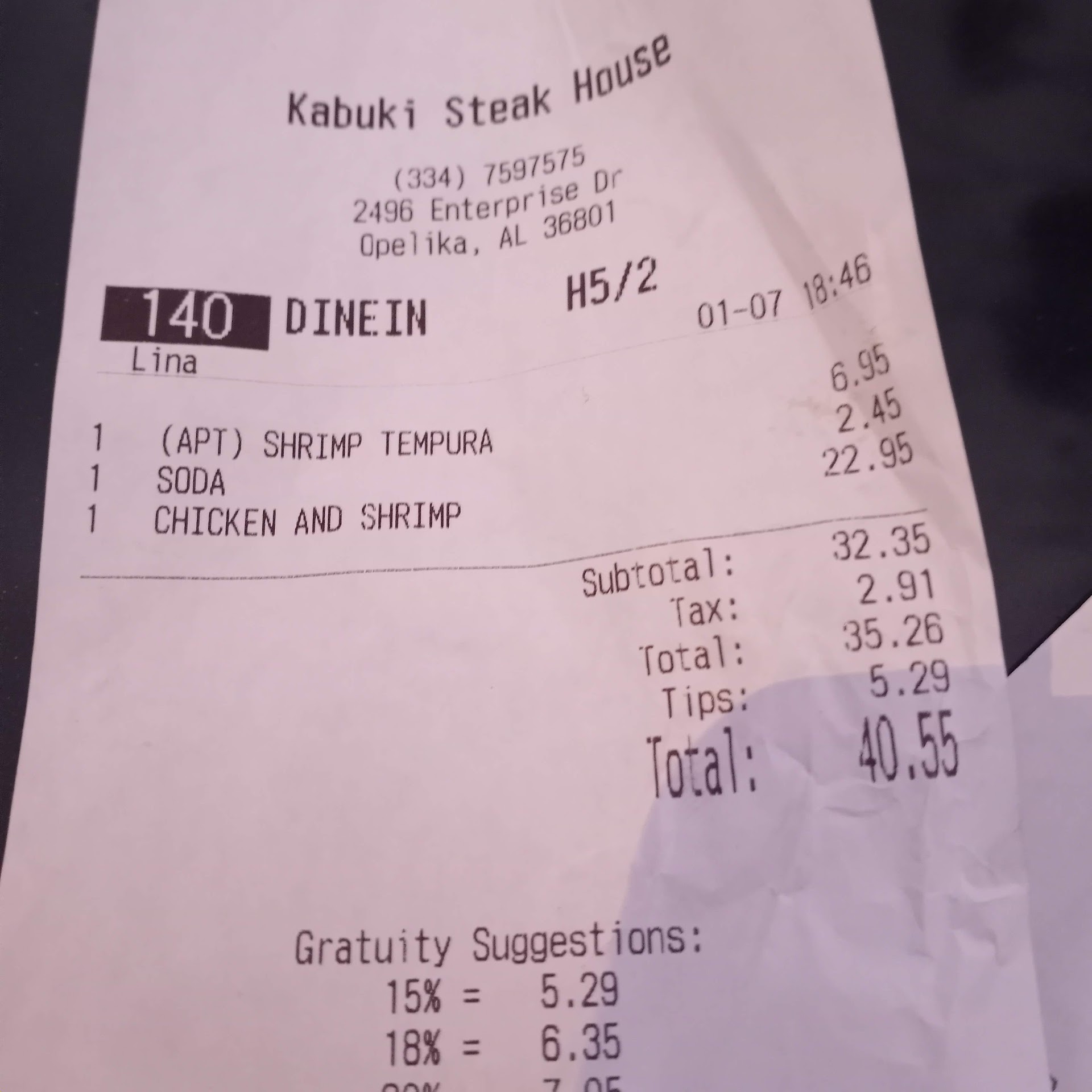 Last night I had the pleasure of eating at Kabuki in Tiger Town with my family. I'm going to start with the wait. We are sitting awaiting to be seated for 5 guests. As I sat there, I saw others come in and be seated immediately. The last family they asked b4 is said no to something but was about to be seated before us. But they said no. In turn they seated us. The appetitizer delicious. The main course shrimp and chicken was a disaster. The shrimp was good at first but when it got a little cool it didn't taste so hot. That chicken never was hitting it. Here goes the prices on the menu and the prices on your check does not match. The check prices are higher. Oh your tip is calculated in your meal price. Not once did anyone ask how is your meal? I didn't like it with the yum yum and without it. It gave me diarrhea. I stayed in the bathroom for an hour with liquid diarrhea when I got home. Also the women restroom was not clean and out of tissue. The empty rolls of tissue were...