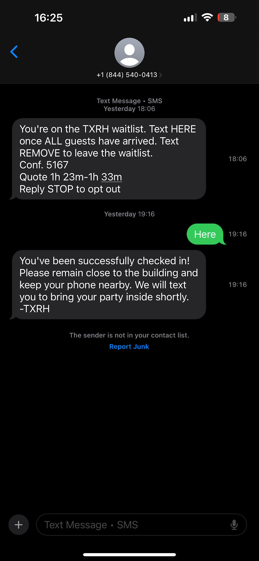 Read moreI called last night at 6 to join the waitlist for my 10 people group and the lady on the phone said that they could get us in around 730. She said that I will receive a text message and when all of us arrive to text HERE to be automatically checked in and that we won’t have to go up to the hostess to check in. So we all arrived at 7:15 and I texted HERE and I got the confirmation that we were successfully checked in. So we all wait and wait and wait and wait. So finally at 8 my fiancé’s nephew went up there and asked how much longer it was going to be. 50 MINUTES!!! Like what!?! He was told that we should’ve checked in at the desk when we got there. What’s the whole point of the text then and telling us that we didn’t have to. So then my fiancé goes up there and she tells him that another big party came in not long before we was coming. So we decided to wait some more. 15 mins we were told that they cleaning off our tables. Awesome we can finally sit down and eat. NOPE! Another 10 mins go by. They call a party of 12 up (that got there way after us) to take them to a table. Like what in the actual you know what. So my fiancé goes up there to see what in the world is going on. Well after he talked to them for about 5 mins they decided to FINALLY get us to the tables after an hour and half after checking in. Yesterday was a very special day my fiancé’s sister, her 2 sons, her sons girlfriend, and his best friend drove from Tennessee and south Florida to surprise me with the best proposal ever!!! Plus he hasn’t seen them in over 1-2 years. Some people may wonder why not go somewhere else well most places had a 40 min wait and Texas Roadhouse has great food and we all wanted that. Plus we were already there for 45 mins and by the time we go in somewhere else we could’ve got in here. The food was absolutely amazing as you expect. But don’t let someone call and have them wait an hour and half to come just to wait another hour and half to be sitted after giving them useless information. I’m including a screenshot with the...