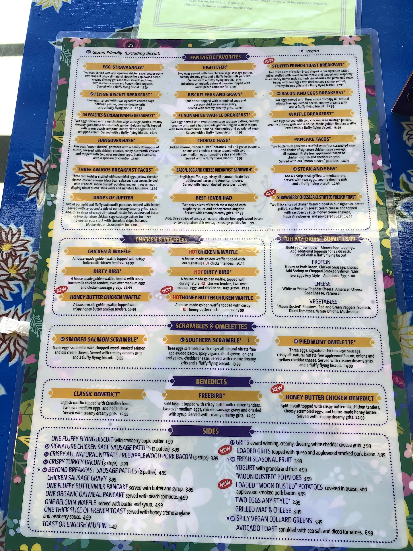 Nevertheless, we accepted a booth inside the restaurant. Our waitress Alicia was pretty fast in taking and providing our order, pleasant, and personable. We had 2 separate tickets - (1) 1 dirty bird, 1peach/mango waffles, 1 loaded potatoes, and (2) 1 Fried green tomatoes, 1 dirty bird, and 1 loaded grits (ticket #6827).