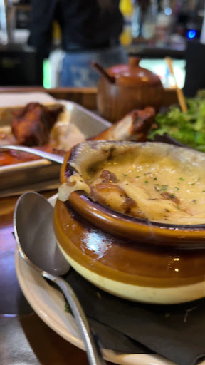 Starting with the French onion soup, it was a comforting dish, but there was a surprising twist: it was made with oregano instead of thyme. While oregano is a flavorful herb, it didn't quite provide the classic taste profile that makes French onion soup so beloved. It was a unique take, but we found ourselves missing the familiar warmth of thyme. They, as many others choose the topping of Swiss, instead of Gruyère. Another disappointment.