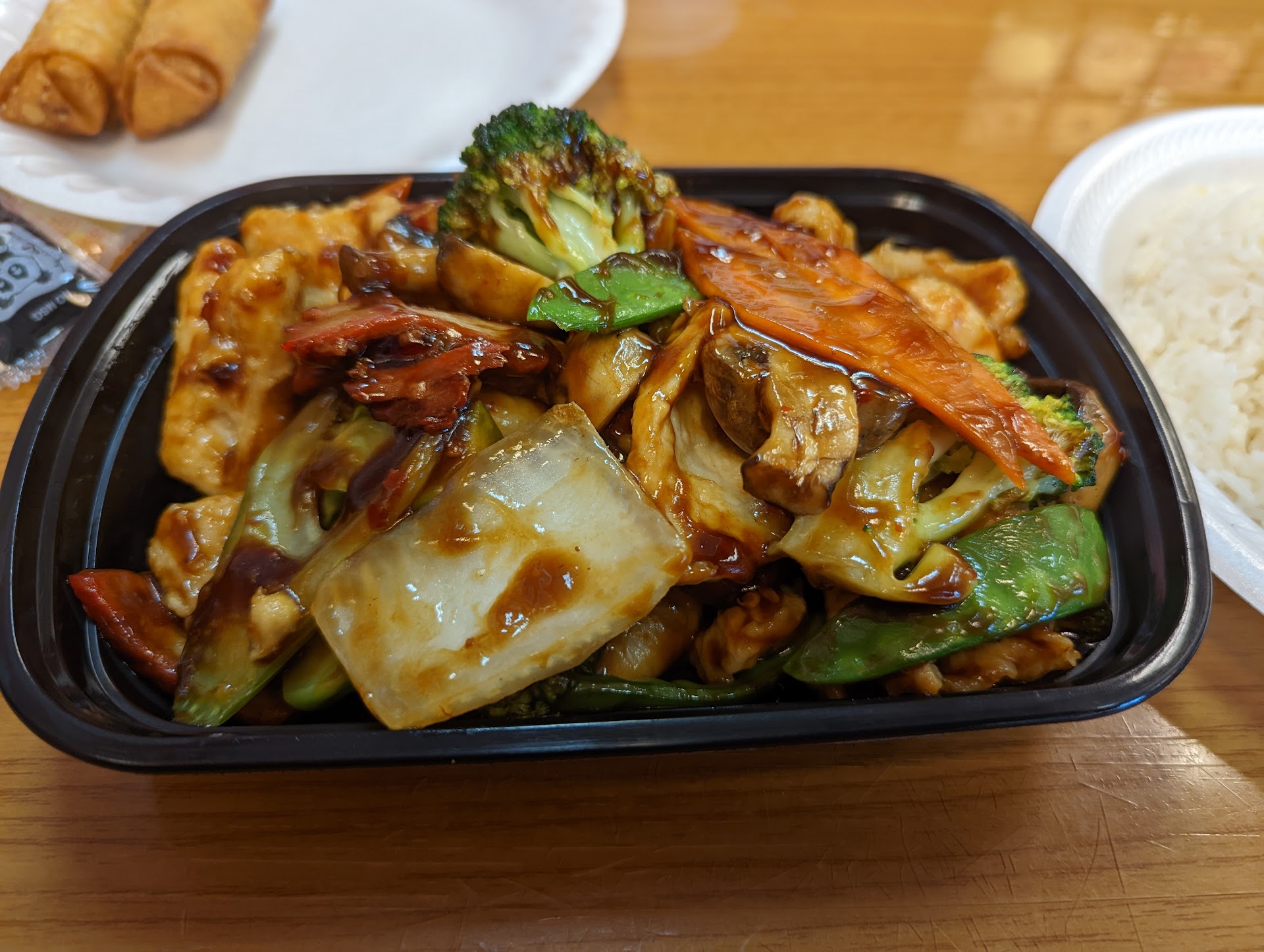 I tried the Hunan Triple, which the lady at the counter said was “medium-spicy”. Tender cuts of pork, chunks of chicken breast and some surprisingly decent-sized shrimp were served with a mix of vegetables including mushrooms, baby corn, carrot, onion, green bell pepper, water chestnuts and celery. The Hunan brown sauce was only mildly spiced, but it was a good medium consistency and not overly sweet or sour. It was really good but I’d love it to be more spicy. Then again, I say that for every Chinese restaurant in this part of the country.