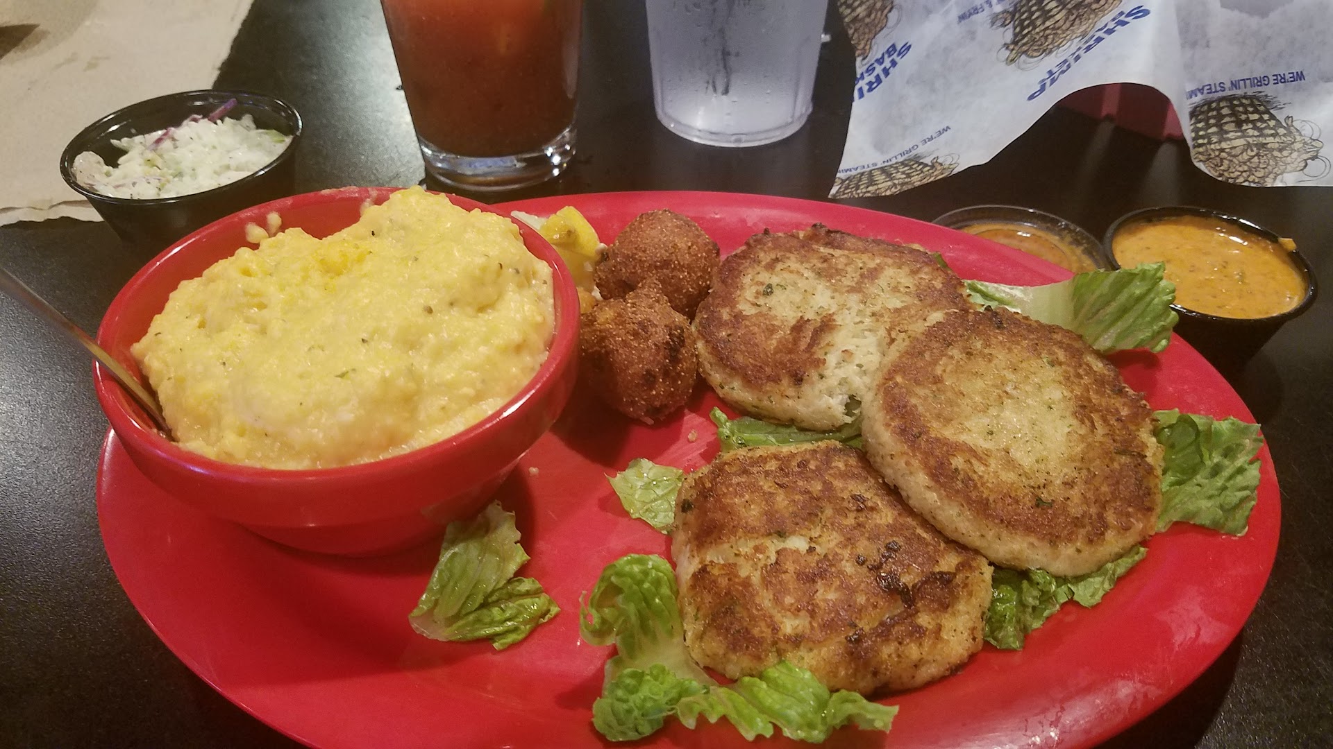 Read moreAfter driving all day we wanted someplace we were kind of familiar with and since we ate here last year and liked it well it won. We did discover that with a large group the best time to come on a Friday evening is about 5:30 no fuss, no muss just how many in your party & how many kids menus will you need. It was great, nice young gentleman said follow me and away we went. After 10hr drive that is exactly what the Dr ordered plus an Alabama Sunrise! (see picture) Next came our waitress so dang sweet and very attentive our water glasses or kids drinks never went empty and with my family that is a big deal. We ordered 2 appetizers for the table fried pickles (yea i know can get those any where in Texas but wife & daughter love them) & seafood queso that came with baked pita chips. Both were plentiful enough to make couple trips around the table and very flavorful. The fried pickles are the sliced chips not wedges and the breading is very crisp & light not over seasoned or heavy lets the pickle taste come through. Now my favorite was the seafood queso with crawfish & crabmeat mixed in had just enough of a little cajun bite but not overwhelming that I had to bogart the majority of it. Unfortunately that is where all the goodness ended. While or entrees were alright we had high aspiration from previous year. My wife ordered the crab came plater w/side of cheesy grits while the crab cakes were ok the grits not so much lacked flavor and kind of lumpy, she adds sankt, pepper and a little hot sauce just to give it something very disappointing. I ordered the blanked red fish topped with a seafood cream sauce on top of yellow rice. The cream sauce had goo amount of crawfish and crab in it and was alright in the flavor department and it needed to be the red fish was WAY over cooked and very dry so you needed to make sure cream sauce was on every bite. My brother in law had a catfish Po Boy while it was alright it was not on authentic NOLA type po-boy roll, you know the one fresh chewy and stick to the roof of your mouth. He did say the catfish had a good flavor and was not over breaded. After contemplating the many desserts we decided no, and would settle for some "over priced" ice cream at Kaydens Ice Cream & Candy Shoppe. ..but that is another review for another day. Maybe the cook was off today or just having a bad day it has been probably a long summer for them so we might give another try before heading back to great state of Texas at the end of...