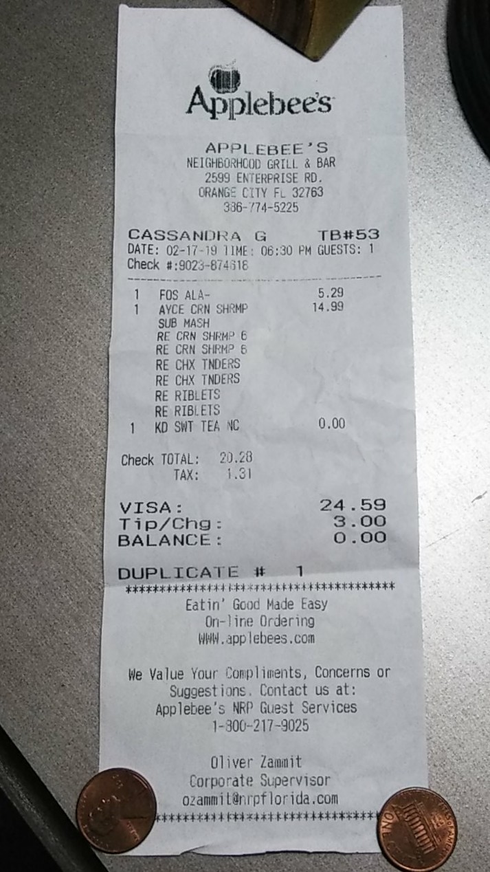 Read moreThis place deserves 0 stars. Arrived around 10pm. Waited about 15-20 minutes for a server to take our drink order. He took our appetizer, beverage and food order at the same time. Appetizer came out about 10 minutes later and still hadn’t gotten beverages. I had to ask for our beverages again. Then waited for our beverages from a different person. It took 34 minutes to get a Diet Pepsi and a Mountain Dew. About 20 minutes later our food came out. My meal was missing an ingredient and the woman who brought it out said “they are out of it so I hope it’s okay without it.” If I would have known this beforehand, I wouldn’t have ordered it. The server was not attentive at all. Our cups sat empty almost the whole time. The woman who brought our food advised us that she would take my meal off. We both ordered the same thing, but my husband ordered it without bruschetta, so he didn’t end up with a missing ingredient like I did. The three cheese penne is $2 extra on the 2 for menu. So in this case if she took $10 off to comp my meal, that means we paid pretty much full price for our appetizer because technically this is 2 for $29. If both our meals are worth $10 each, that made the appetizer $9 and the appetizer regular price is $9.99 but half off during happy hour. This meal took a little over 90 minutes from start to finish, so glad that I could sit there that long to watch my husband eat and have to beg for a drink. At the end of my husbands meal, I suggested to him to get his card out to pay for when the server brings our check because he will take ages to come back. He came back and asked if we needed a box. He brought the boxes and a bag but no check. Had to wait even longer to get the check.