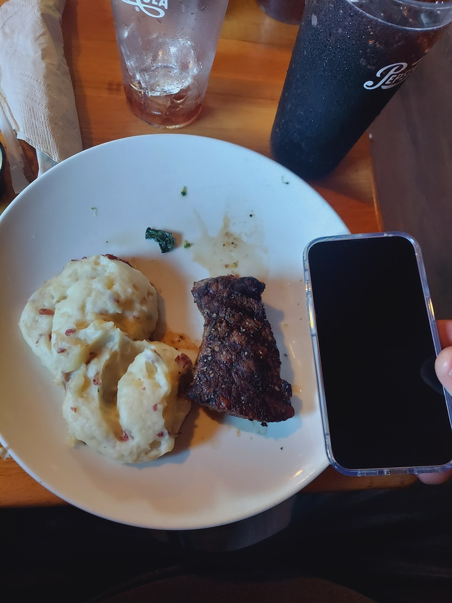 Mariah was our server and she greeted us at our table with a happy and friendly greeting. She to our drink and appetizer order. We ordered as soon as she came back. I had the bourbon steak with garlic mash potatoes and a house salad. My also ordered the 8oz Top Sirloin. Our food was perfect. The steak melted in my mouth and the garlic mashed potatoes were wonderfully buttery with a hint of garlic.