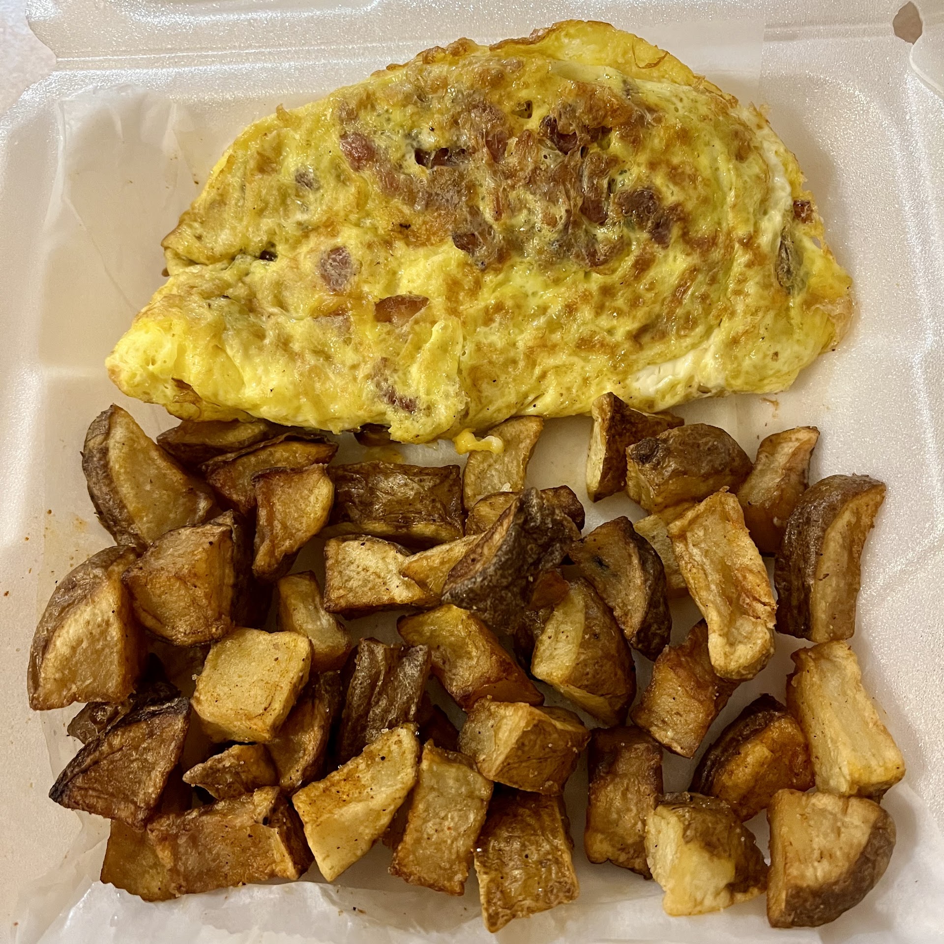 I ordered a bacon & cheese omelette w/ home fries and the butter chicken w/ rice & naan. The omelette was slightly more browned than I would prefer, but not burned, the bacon was tasty and plentiful, and major points for using cheddar by default! The home fries were delicious also, fully cooked and soft inside, slight crispness on the outside (probably were crispier before their 20 min car ride to my house, but I wonât hold that against the restaurant).