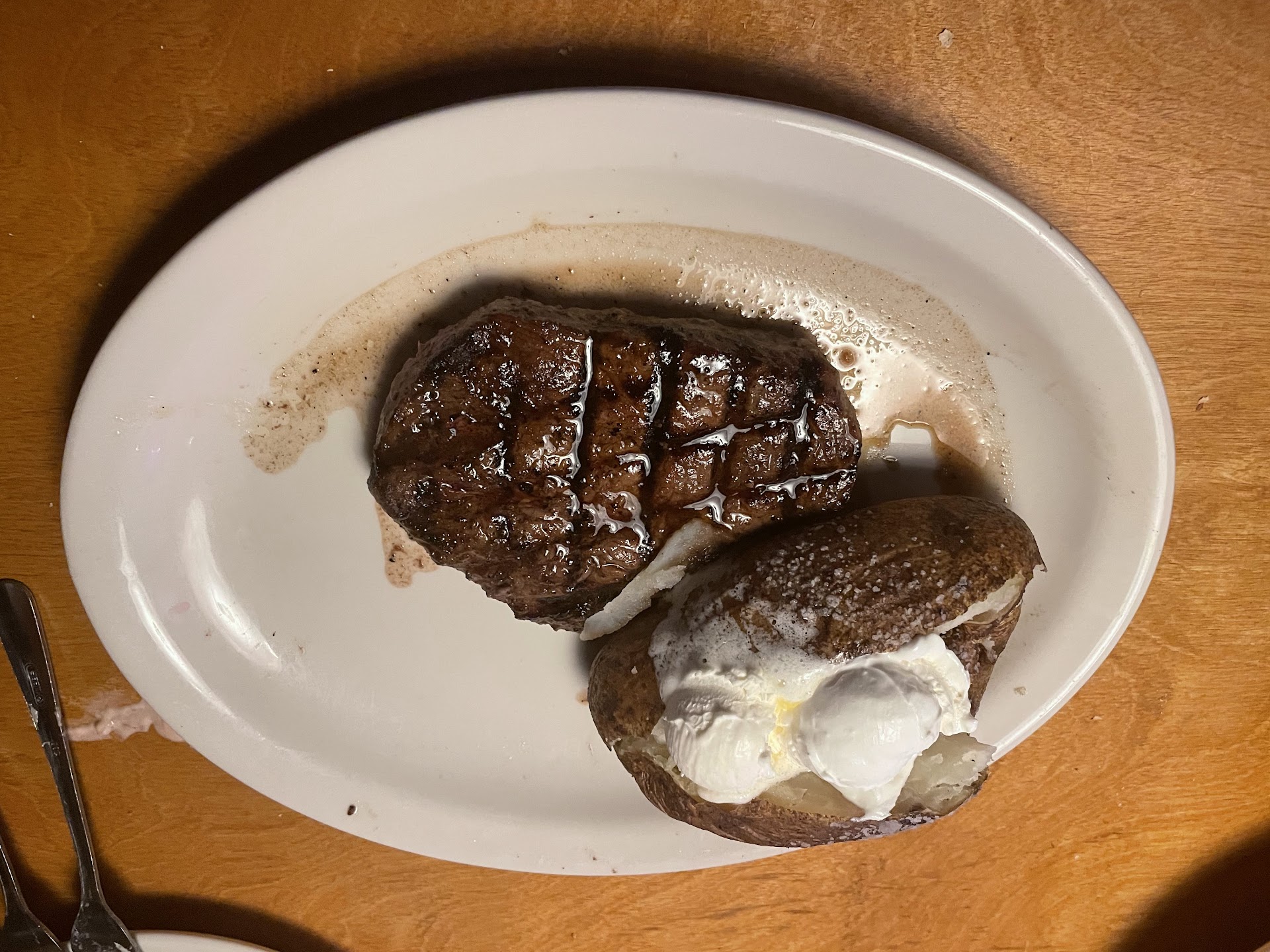 I ordered 16oz sirloin, medium rare with a salad and a potato. My wife ordered a steak - well done, with ribs combo. Her sides were chili and potato. The chili arrived lukewarm. Disappointed, my wife just asked for a container to bring it home. I enjoyed my Cesar salad.