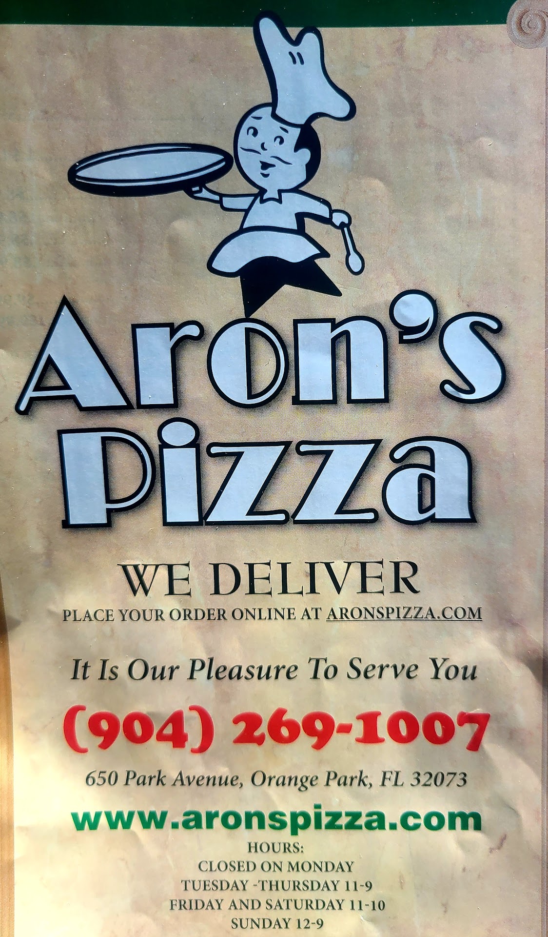 We have lived in Fleming Island for about two and a half years and have seen Arons when driving past and have wanted to try it. A few months back we finally stopped and went in, but sadly they were having staffing issues and told us up front we would have a lengthy wait, so we thanked them and left. We finally made it back for dinner tonight and decided to have pizza and order some pasta and garlic knots as well. Garlic knots came out first and were piping hot. They were sitting in an oil and garlic slurry that wasn't bad, but it should be butter, not oil. The knots were fresh, hot, and tasty. They were pretty heavy and dense, but good. 8/10 The salad for the lasagna entree came out second. Pretty plain with just lettuce, a couple of very thin slices of tomato, and some shredded cheese (more on the cheese in a minute). The ranch dressing was nice, rich, and thick, but overall a pretty sad looking salad. 5/10 The next item out of the kitchen was the "lasagna". Yes, I use quotes because I am not sure what it was, but it was certainly not lasagna. It was two layers of plain noodles on the bottom with nothing between them, then a layer of finely ground meat, no cheese, no sauce, no flavor, and finally 2 more layers of noodles on top, again with nothing between the layers. The only sauce and cheese in this concoction was poured around this mound of hamburger and noodles in the cold bowl it was served in and it was topped by some of the same cheese topping from the salad. 4/10 A short while later the garlic bread for the entree came out, I didn't try it, I had enough carbs from the pasta noodles, knots, and pizza that would be coming out Finally, the pizza arrived. I could tell from first site it was not going to be great. There were ample meat toppings (it was the meat specialty pizza), and it had the same cheese topping as the salad and pasta. It was very hot and the crust was nice and crispy. Sadly, that is the end of good things to say about the pizza. As someone who grew up in the Midwest (central Indiana) this is what I would expect from a local diner in a farm town in Indiana. It had no flavor at all. Think of the last frozen pizza you bought, this was almost, but not quite, that good. 5/10 About that cheese topping, I should use quotes for that as well, because not sure what it was, maybe it was fat free cheese or maybe it was vegan cheese, or maybe it was some other kind of fake cheese, but it was unlike anything I have ever seen called cheese and it was certainly not a quality mozzarella. Even though the pasta dish and the pizza were piping hot, the cheese simply did not melt and get gooey, and it had no pull/stretch at all. 1/10