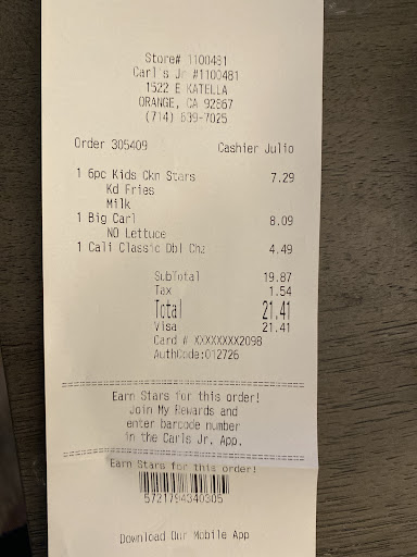 Ā Ā Ā Read moreI've become so disappointed with this location. We live two blocks from here and its been our go-to-place for as long as I can remember. My last six visits have left me with a cold famous star each time I've gotten home. Tonight is my last visit to this location. I thought I'd try the All Natural Burger to see if my luck might change. I took two bites and threw it out. It was cold, soggy, and drenched in mayo, mustard, ketchup. When my husband and I eat out, its because we've had a long day and are too tired to even make a salad. We're too tired to return the food. I guess I'll make a salad. Thanks once again Carls Tustin/Katella. You've lost two 20+years customers. Not wasting one more penny on...