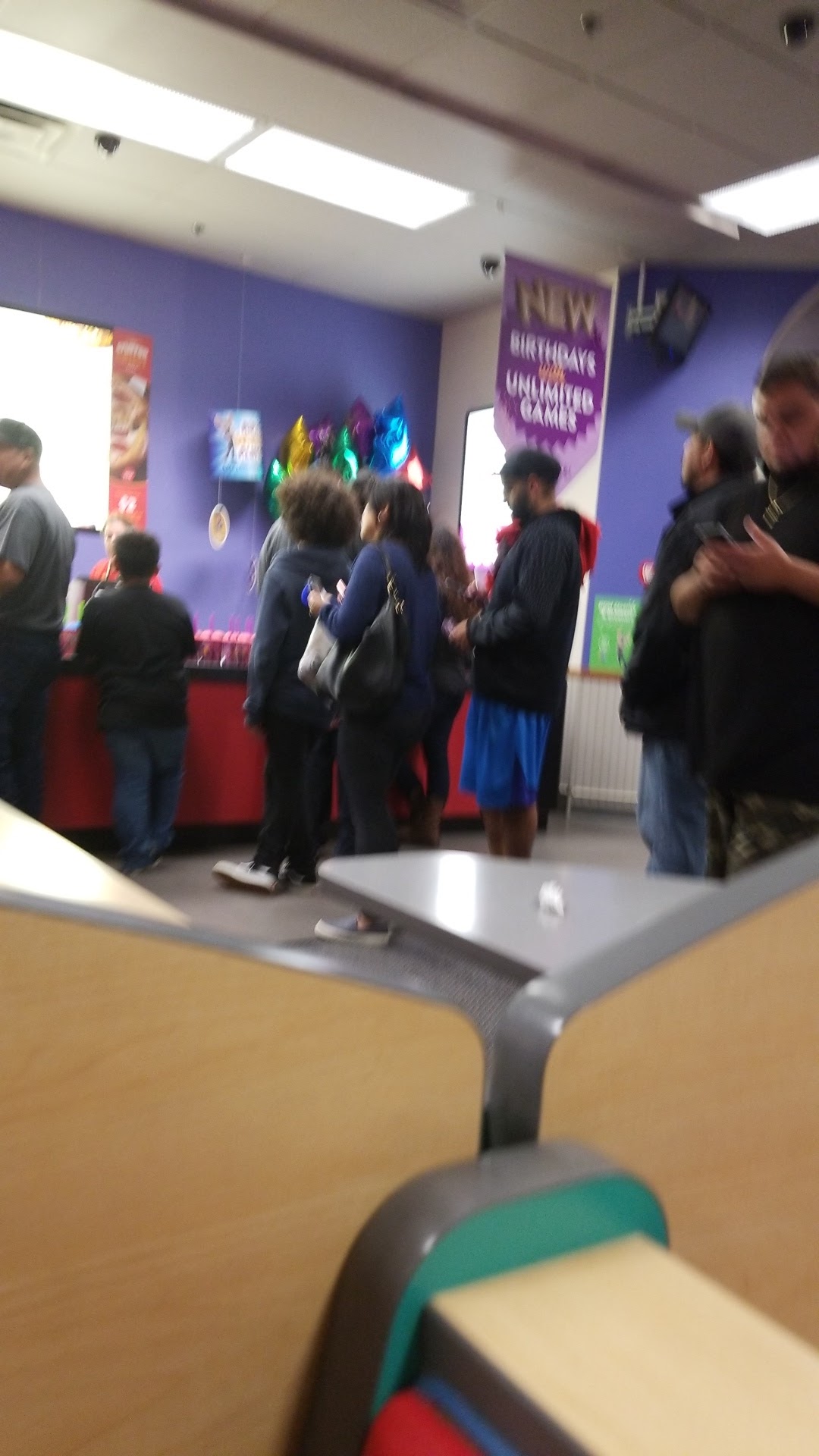 like always it's the same at all chuck e cheese very disappointed the machines don't work no one ever around to fix the machines the staff made a suggestion that for 15dollars I get 30 points or 15mins unlimited play something like that she suggested the time so she said we can get more tickets well each machine takes a min to load and run the card so it's not unlimited pretty much u get 15games that's it on machines that don't work and no staff members any where to help so there goes ur 15mins WHAT A SCAM save ur money take the kids somewhere else o and also let me mention that since no staff was around NOTHING IS GETTING WIPE DOWN I saw lots of HEALTH DEPARTMENT VIOLATIONS I got to call them aswell I took pictures that are not appropriate to post up of the disgusting things I encountered I will though forward them to health department I gave the manager the opportunity to make it right at the store and showed them the areas of concern and they said I'll have someone come and take care it what was he doing that was more important then the health of his customers and he pulls the girl checking numbers at the door 10mins later to it and nows leaves the front vulnerable for kids to get out what a I better not say but u get what I'm trying to say I told you I'm a local guide and I write honest experiences that I encounter and...