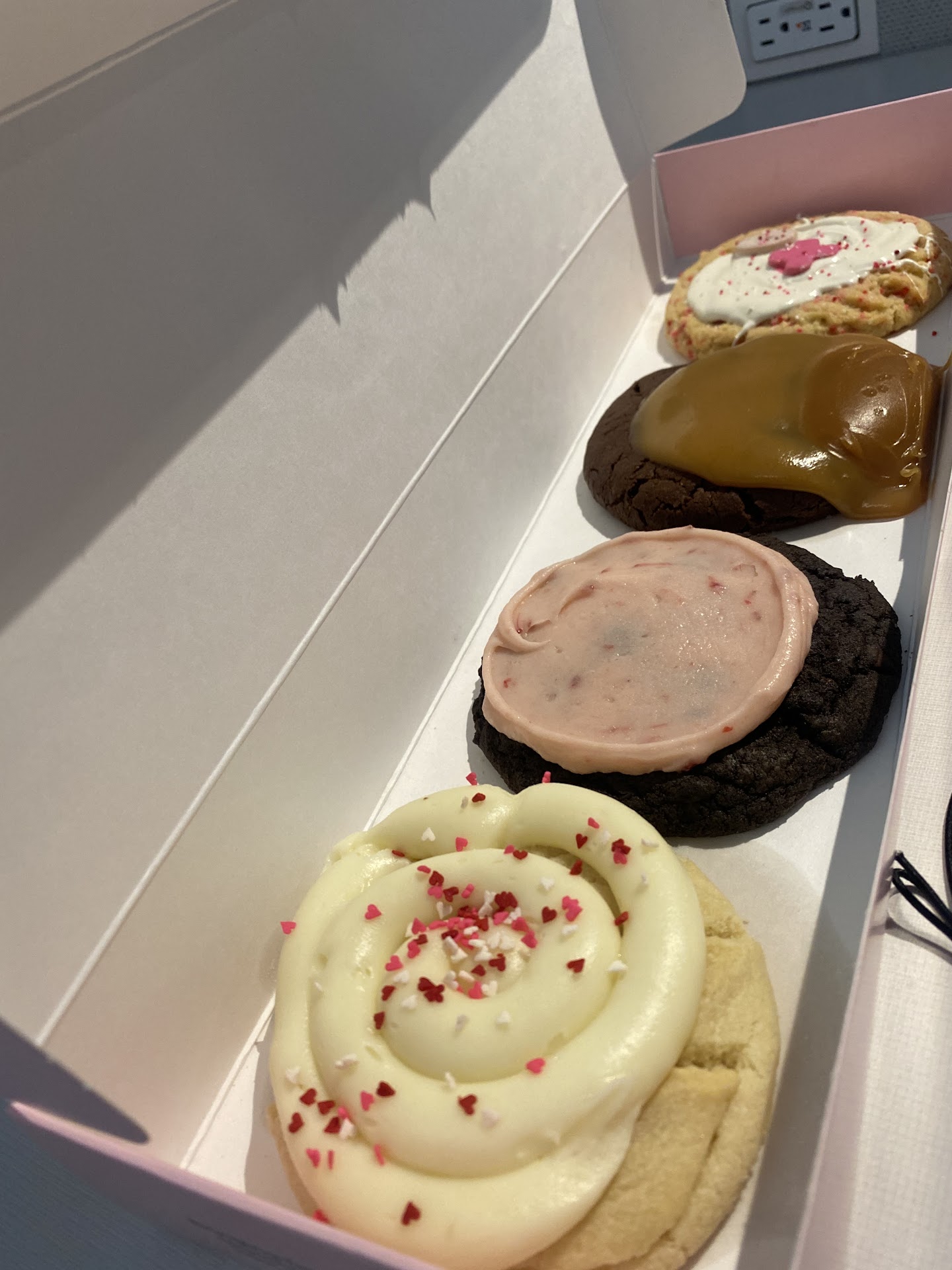 For the cookie flavors, this week they had 6 different options and I chose the following: Birthday Cake (Valentine), Chocolate Strawberry Cheesecake, Chocolate Caramel and Sugar ft. Mothers Valentine's X and O's. I LOVED the cute Valentines themed cookies. Perfect for the occasion. I only tasted two of the cookies: Birthday Cake & Chocolate Strawberry Cheesecake. Both were delicious! Very sugary, they come topped with icing so it was a definite sugar rush! The cookies are much bigger than your average size so the hefty price isn't as bad.