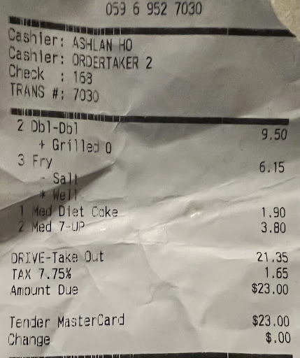 Read morei normally never write reviews but the service at this location was so exceptionally horrible that i felt compelled to leave one. i came in at around 2:15p-2:30p (12/29/24) and was helped by a younger brunette woman on the registers (i was order #35). it appeared that two of her male coworkers were visiting on their day off because they greeted several of the other workers and asked who the working manager was today. they stood behind me and were inaudibly trying to communicate with her while i was attempting to order. the woman "helping me" on the register could not focus for more than a few seconds because she spent the whole time giggling and watching them. she asked me to repeat my order 3 times and it was STILL wrong when i received it. the first time she repeated it back to me she added an extra item and i corrected her but i failed to catch that she actually added 2 additional items to my final order that i did not ask for. all i ordered were 2 plain patties, 1 cheese fry, and 1 regular fry; i received (& was charged for) an extra order of fries. i wish i would have kept my receipt so i could have gotten her name because her actions were beyond unprofessional...