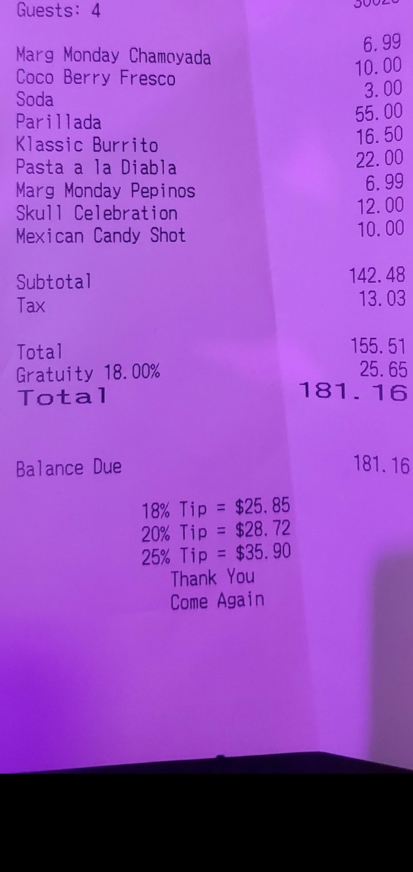 While the chicken in our fajita was delicious, there was hardly any onion or pepper in it. As I requested them not to put the pasilla pepper or the mushrooms in it, this meant very little was there to put in my tortilla other than the chicken. They gave us three Tortillas for an entire order of fajitas. My teen would later tell me their food was not good.