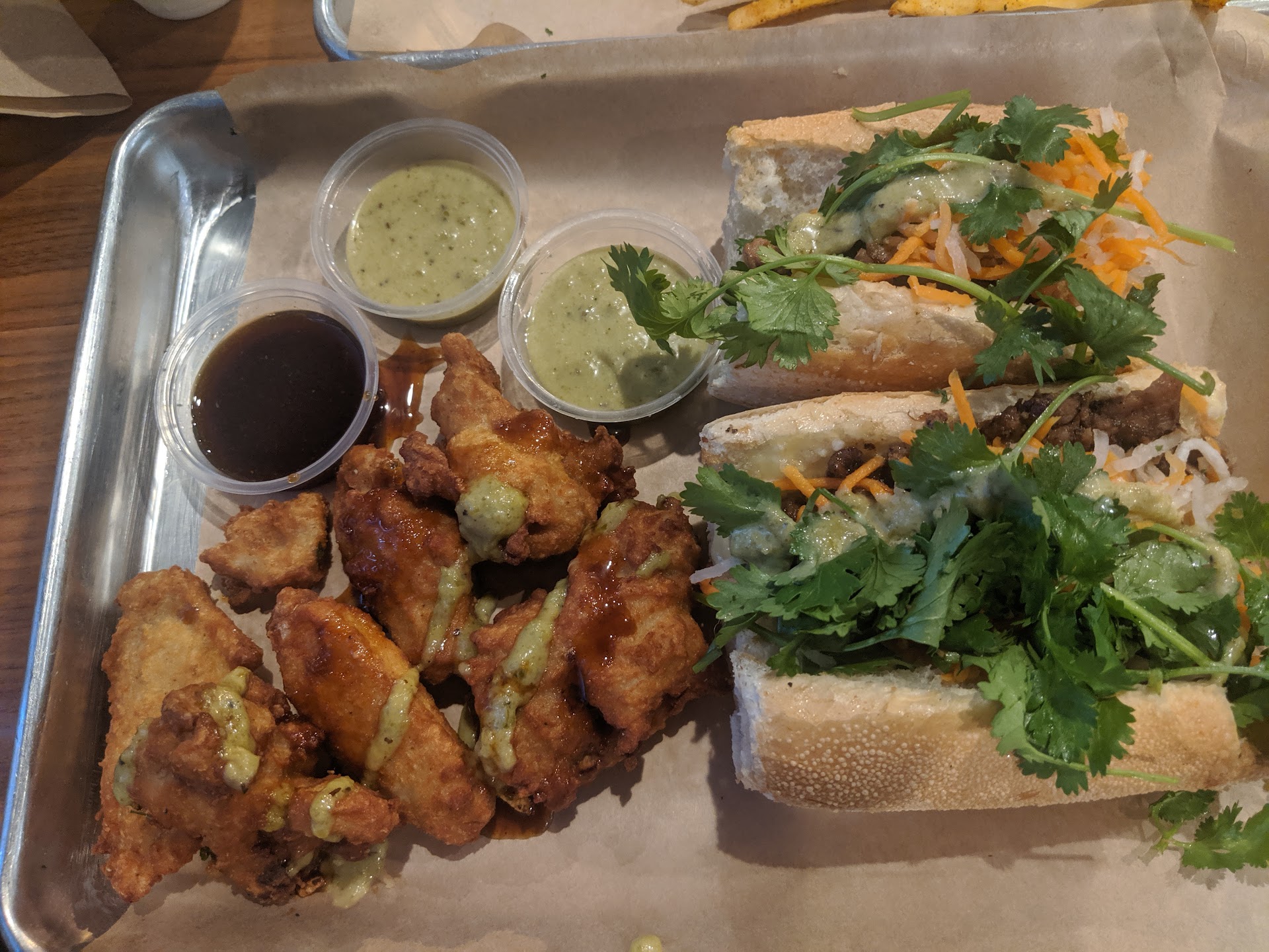 Read moreIt would have been a great place for some good asian fusion quite bites, but overly almost everything was overly salty. The food presentation is good though and made it very appetizing initially. This place is a small restaurant with few tables, but it doesn't get too crowded on a week night. They serve mainly simple quick food that is a fusion of vietnamese and korean cuisine, such as usuing bulgogi in their garlic fries, banh mi sandwiches, and garlic noodles. I ordered their more well known grilled pork banh mi style sandwich, and my ordered their chicken salad. We also got the garlic fries with bulgogi added, and their chicken wings. The Banh mi with grilled pork was really good. I just wish it was a little bit bigger. It's about 6inches total, cut into 2 pcs. For the price I guess it's not bad. The garlic fries were okay. It was heavily seasoned, and the garlic was extremely salty. Had they use less salt it would have tasted much better. It comes with green spicy cream sauce, which is very similar to the ones found in peruvian restaurants as a dip for bread. The bulgogi on the fries was so-so. It was overcooked and dried. I couldn't really taste the sweetness of the marinated bbq sauce, which is traditionally used in bulgogi. It was also too salty. The chicken wings were average. It was also extremely salty and overseasoned. The batter was okay, but it wasn't wow'ed maybe because of too much sodium overpowering all other flavors. It comes with a sweet honey glaze type sauce, which helped a little bit to offset some of...