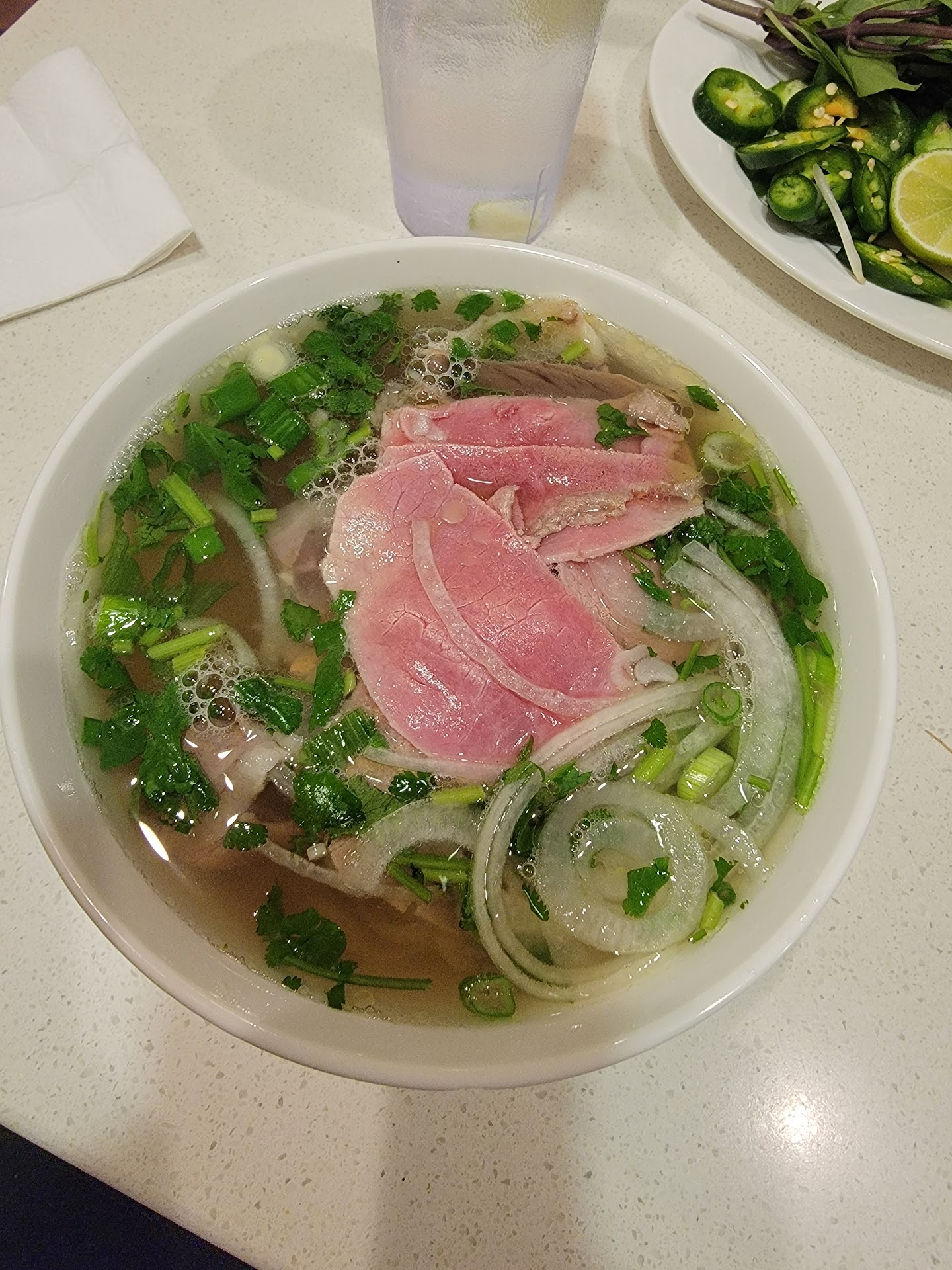 Read moreMy experience didn't start well, because the prices online did not match with what is charged once inside. For one Lg. bowl of Pho - Rare beef (nothing fancy), a side of noodles and a 6 piece egg roll, the order came out to $30. None the less, my son and I were excited to get home and try it. Thank the holy Lord above that I payed the $3 for extra noodles, because the ones in the bowl were covered in blood from the raw meat that was loosely wrapped in the baggie and placed upside down on top of the noodles in the bowl (come on man, at least seal the bag or wrap it properly). After discarding that set of noodles we split the other noodles into 2 servings and began to eat. The meat was chewy and inedible. We both spit it out. So we pretty much had broth and noodles for our $30 meal. The egg rolls were not much better than the meat in the Pho. I didn't even finish one of them. The only reason for the 2 star review is the saving grace here - The broth, it did have good flavor.. But honestly, I wouldn't come back. I had high hopes for this place, seeing how busy it always is, every time I come to that parking lot, so maybe we came on a bad day. Who knows. . My journey for amazing Pho in my beautiful city...