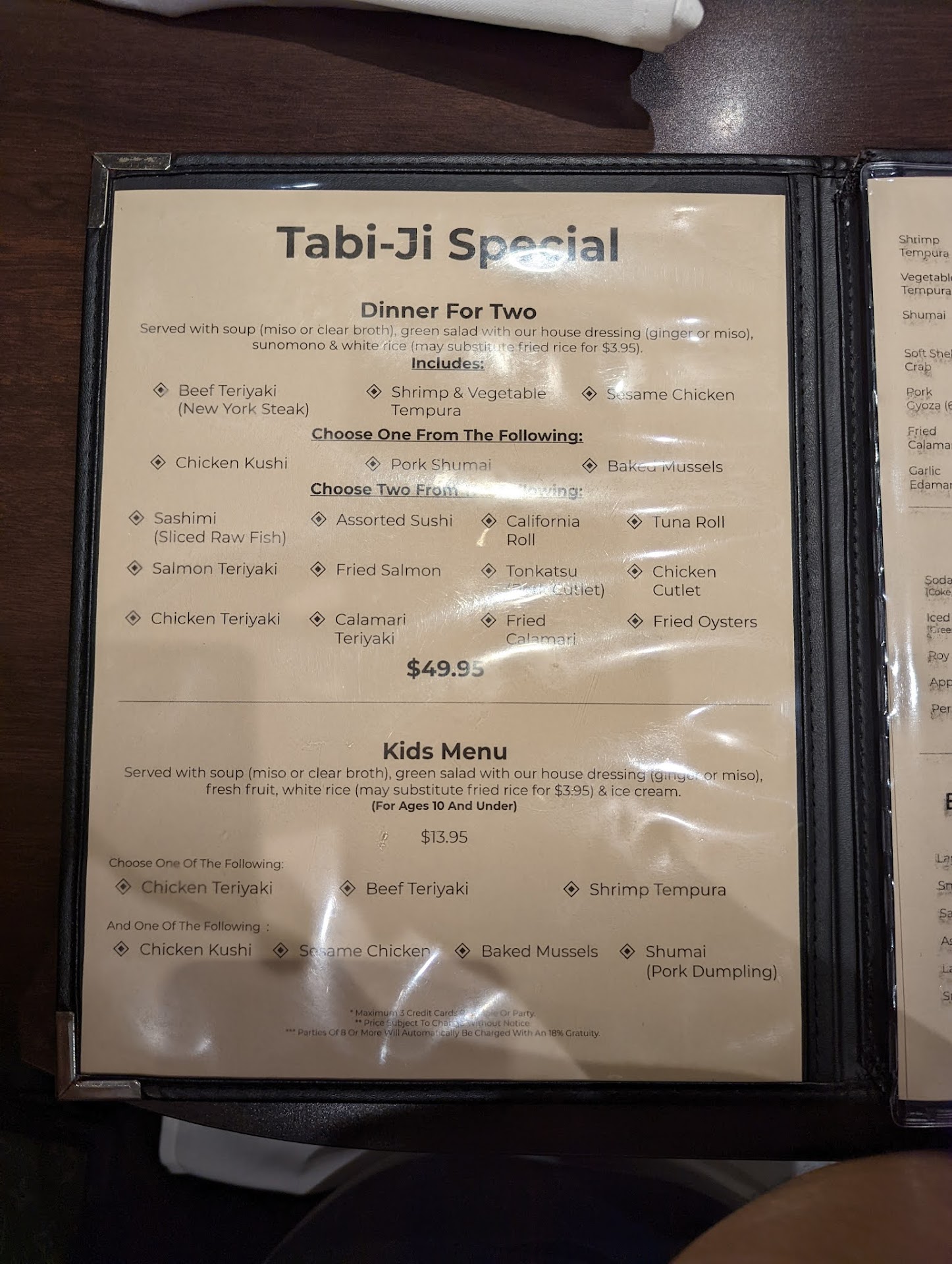 Read moreTabi-ji is not just the greatest Teppanyaki restaurants in Orange County but it’s the greatest in all of California! I’ve been coming here for six years and never found another Teppanyaki place that can top this one in the entire state! While the food here is top tier and amazing, what it makes this restaurant so special is how super friendly, personable and hospitable the staff are. If you come here more than once, the staff here will remember you, your name and will treat you like family. All the chefs here are masterful at their craft and my favorite is the head Richard who will prepare your food to your liking. Like traditional Teppanyaki restaurants, your meal comes with soup, salad, steamed rice or you upgrade for fried rice, shrimp appetizer and hibachi. vegetables. My personal favorites here are the châteaubriand paired with their hibachi chicken. The garlic butter they use here is the best tasting I’ve had anywhere and their ginger sauce and mustard sauce are out of this world and will give your meal those delicious umami flavors you find typically expect from in Japanese cuisine. If you’re tired of Benihana and looking for the ideal Teppanyaki restaurant is the restaurant must come to. He will...