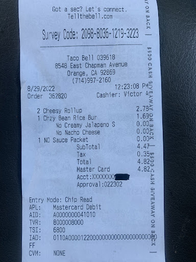 Read moreFirst I’ll start by saying I love Taco Bell food so it’s a no brainer that I would write a good review, which is the case in this review. But, Taco Bell or not, the employees can make a huge difference in your experience. The manager at this Taco Bell (Chapman and 261 toll rd area Santa Ana I believe) is always on his game. He has this place in impeccable condition and running as smooth and quick as anyone could dream. Congratulations this Taco Bell gets my best of award for everything. I’ve eaten at Taco Bell everyday for the last 20 or more years. Therefore I am an expert Taco...