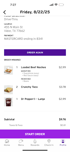Read moreI honestly have never eaten at a worse Taco Bell than this one. The dining room looks great, and the employees were very nice and polite, but the food was some of the worst I’ve had. The spicy potato soft taco was the only thing good. I I received a $7 box that I get at other locations, but this one was the worst. The meat tasted awful, and it all looked soggy at the bottom. I was surprised that it didn’t fall apart. I would recommend the locations in Bridge City, or the other one next to the interstate in town over this one. I honestly lost my appetite after this meal, and I barely ate one bite from each item I ordered, besides the potato soft taco. If I didn’t order that, I would have given zero stars on the...