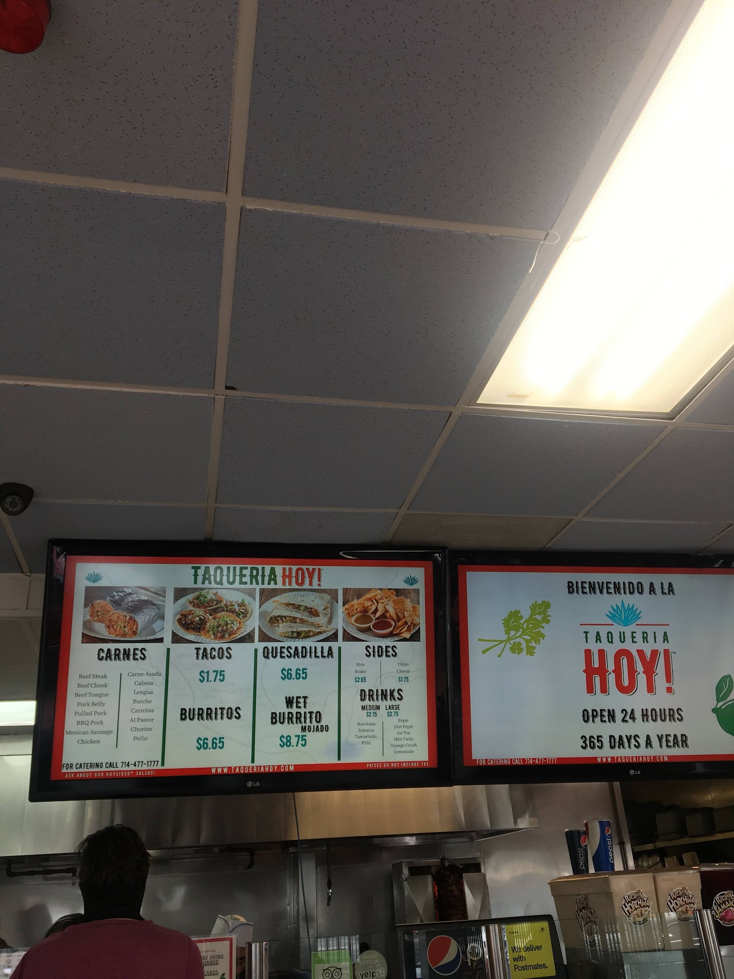Formerly known as Taqueria de Anda, this Mexican food joint offers the basics of a, well... Taqueria. Tacos, burritos, wet-burritos (heck yeah. Al pastor with extra melted cheese on top thank you very much), quesadillas, horchata, jamaica, mexican coca-cola! (Mexican Coca-cola= real sugar! Thank you very much). Taqueria Hoy fails on a couple of major factors: Flavor.) Mexican food is one of the best cuisine in the world! Or so I believe, I don't say this only because I'm Mexican but let's be honest, tortillas, refried beans, cheese! Et voila! You can never go wrong with a bean and cheese burrito! And don't even get me started with the salsas or guacamole! What's up? Sadly Taqueria Hoy lacks that kick in its food that makes you salivate and satisfied after some chorizo tacos. The food here is rather bland. And bland my dear friends is not allowed in the Mexican kitchens. Price.) For 3 tacos and a horchata over $10?.. I'm sorry but 3 tacos was barely my appetizer however now I'm broke and still hungry..... Service.) Mediocre. Business hours.) Here's what pisses me off, is 3a.m. after few beers I walk to Taqueria Hoy, debating wether I want my pastor burrito wet or not. The sign outside the Taqueria says open 24hours. But to my dismay: dining room closed! Drive-thru only! Not only I'm foaming at the mouth because of rage and well, burrito al pastor hungry but also frustrated because: hello I had few beers (more or less but who's counting?) Driving would be foolish, so I did the responsible thing and walked to my burrito only to find out that I can not order my so desired dish via drive through while on foot. Not cool man, not cool... Still 3 stars because, well is a 3 star experience. Actually 2 and a half but that option is unavailable here.. For the heck of it, check it out and let me know if you agree or if my judgement has been tainted because of the lack...