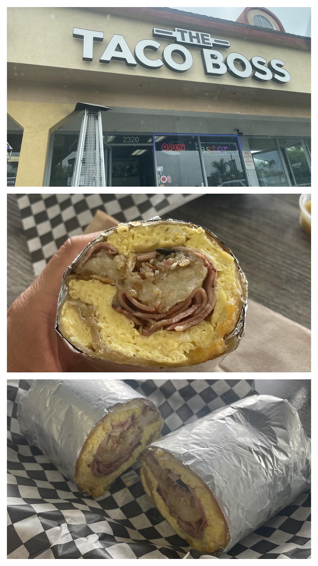 Read moreToday after my mom’s check up, we were hungry and craving a breakfast burrito, so I went to Google Maps to search and The Taco Boss popped up..I am glad it did because they’ve got a delicious, freshly made breakfast burrito. I chose ham with my eggs, cheese and hash-brown..it was made on the spot! It wasn’t greasy, not heavy, simple and delicious! They’ve got salsas and pickled onions and pickled carrots to add if desired! The hostess was very nice and agreeable! My mom didn’t want much ice on the freshly made juice (not pictured-pineapple with spinach) and she very kindly served it with no ice, just what mother wanted. Definitely worth stopping by for your breakfast...