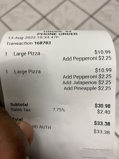 Read moreCame in today to place an order around 4pm. And the medium pepperoni and sausage pizza was burned as nobody was watching my order in the oven. Went up to the counter after 25 min. to ask where was my order and they stood there acting clueless. The pizza maker came up and told me she had to redo my pizza as it was burned by accident. And it was sitting at the bottom oven all black and charred. Other customers were coming in to pick up their orders. And they had no orders for them. And got lost for the order to be made. Very bad first experience for me. And the pizza did not even taste good.So I will say this âStay Awayâ, go else were not worth the wait or bad customer service or were they even organized with the phone orders. A complete catastrophe in the restaurant.
