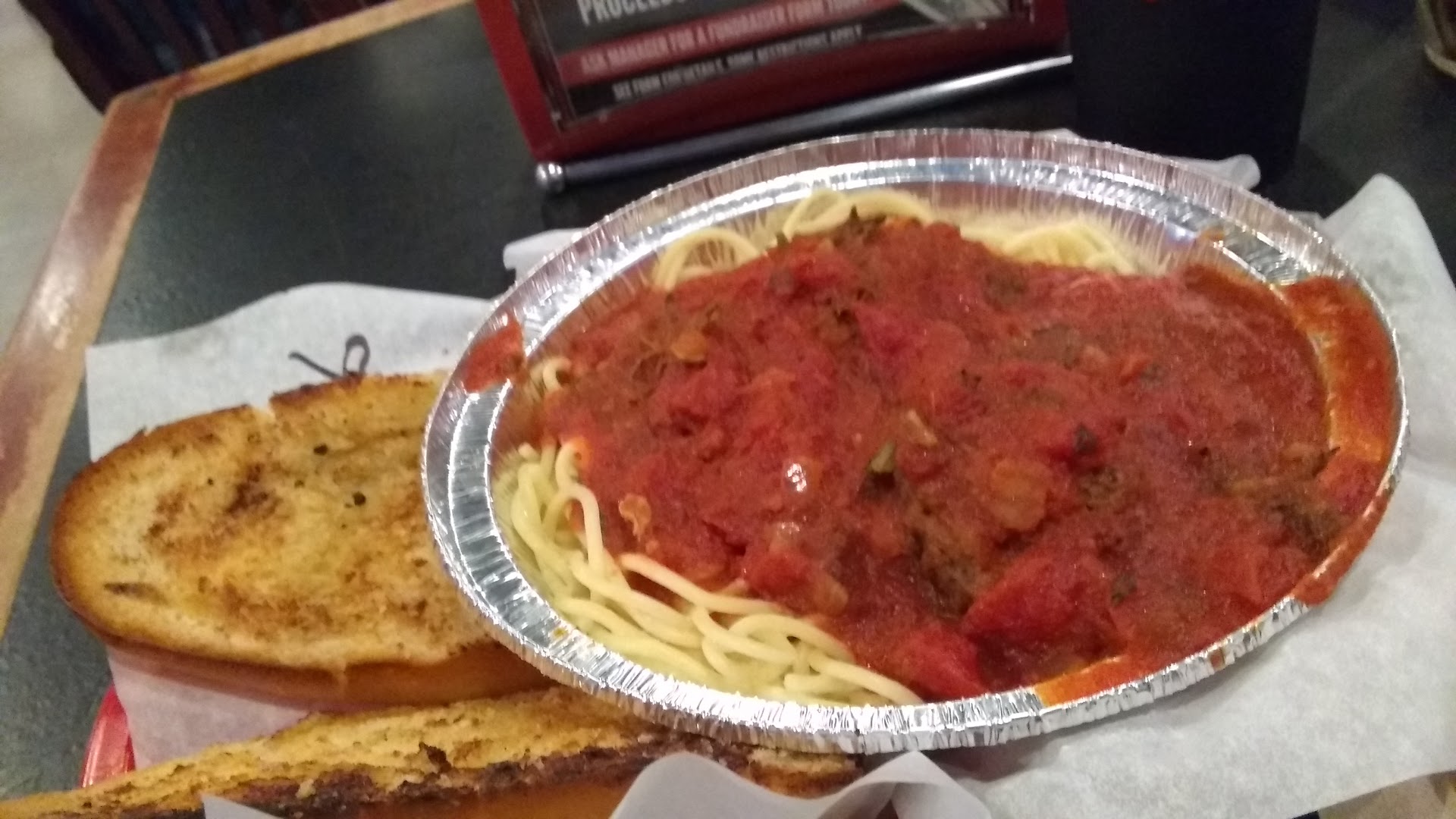 They have a pretty Tasty and Decent Pizza BUT, I went with their Spaghetti & Meatball Plate and a drink🍝🍺. Comes with 2 Meatballs, Pasta, Sauce & 2 Pieces of Garlic Bread.