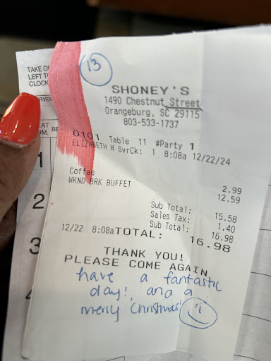 Read moreWe have no shoneys left near our home. On our way home from Florida, we drove 20 mins out of our way to eat here. Such a mistake. They no longer offer breakfast all day on their buffet. The food was okay but was limited for a buffet. The waitress stopped by our table once after bringing our drinks. She was pleasant. However, the manager was SO rude. He was standing next to our table with our waitress when she brought us the check. I asked if I paid at the table or up front. The waitress told us that he (pointed to the manager) would check us out upfront. The manager then replies "if I'm up there, I may just run away." Okay, haha, I can take a joke. However, I'm not convinced it was a joke. We waited for him for a few moments, he takes my card, asks me to sign the restaurant copy. The whole time he's messing with this younger girl who is sitting in the lobby. Doesn't acknowledge us, doesn't ask how anything was, tried to have me sign the restaurant copy again because he was too busy aggravating the young girl, that he forgot he had me sign it already. Actually, he never even said anything to us, not "thanks for coming in", "have a good day." Or anything! It was so rude and I've never seen a "manager" act as childish as he was. Even the young girl sitting in the lobby seemed annoyed by his constant harassment. Even if we are back in the area, we will not be...