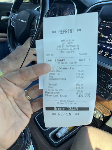 Read moreWe went there late this past Christmas night as we were traveling north. We have been to other Waffle Houses where we live and have been happy with the service, but our experience in this one was extremely awful. I very rarely write any reviews, but our family's experience was so awful that I needed to write this review. The only employees that seemed to be working were the two cooks that were there that seemed overwhelmed, even though the place wasn't packed. The rest of the staff, including managerial staff, were gathered around the cooks talking, laughing, being on their phones and not doing much of anything while everyone was waiting for their orders including several people that had been waiting for over an hour for their take home orders. It was chaotic. We waited over an hour for ours, it came out wrong, the waitress argued with us saying that she served us what we ordered. We had to wait again for our order to come out and when it did she gave us the check to pay. It had somebody else's payment receipt stapled to it, so I didn't know if that was indeed our ticket or not. When I pointed that to our waitress she just tore the stapled payment receipt and said it was an accident. In total we spent almost an hour and a half for really really bad service. We couldn't get out of there fast enough. I really hope that someone from this Waffle House reads this and takes action to improve their costumers' experience. It's...