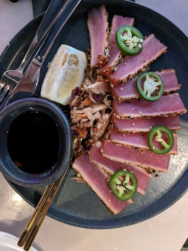 However, the seared ahi was a huge swing and a miss. The sauce served alongside was basic teriyaki and the cabbage was basically uneatable. I love a good pickled vegetable and cabbage but this was not it. To add insult it was served with golden chopsticks under the food. Actually quite a faux pas with Asian foods.