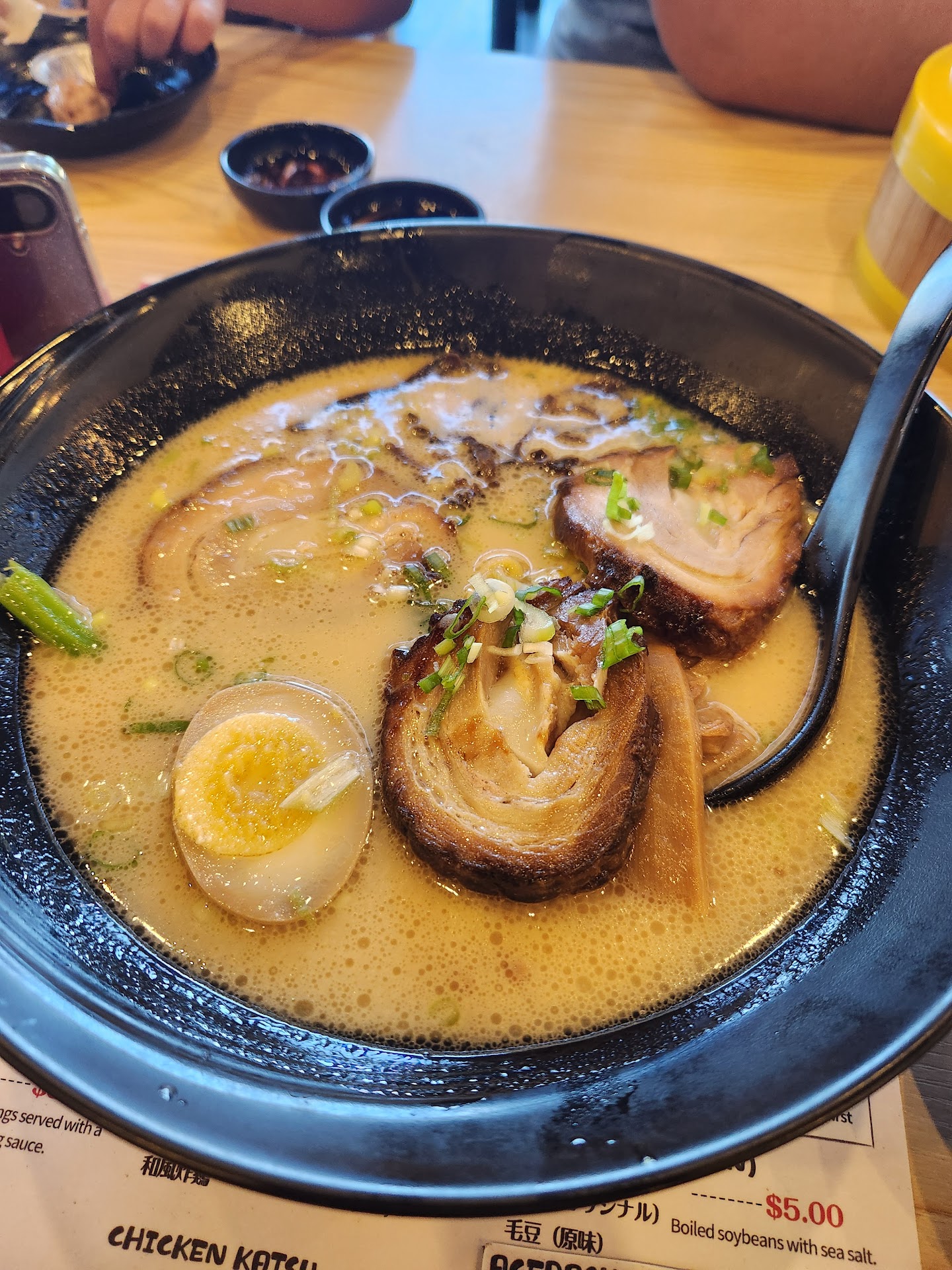 We then went to the waitress and explained that we were not happy with the food and that it was so bad we were unable to eat it. She said she would go get her boss who then came to the table and immediately started demanding that we pay. We were not trying to leave without paying just simply wanted to not pay for the three items we did not eat. The pork wontons, spicy wonton soup and the ramen. The other items we took bites of and were willing to pay for. She was extremely rude, did not offer any solutions or even apologize. Said that all the times sold on the menu come from a box and that they just follow the directions. She said over and over that this is not the place for us and to not come back.