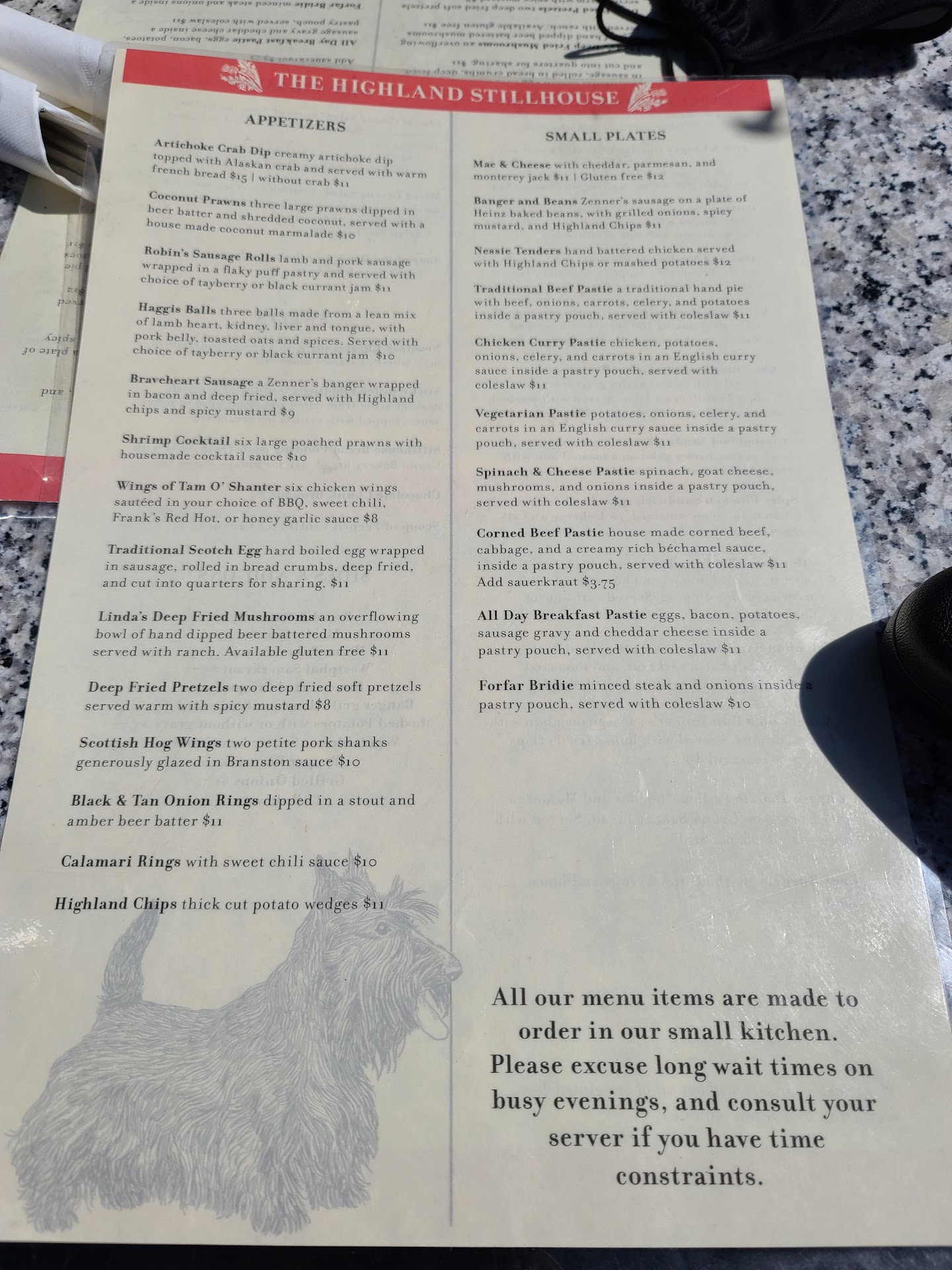 There was not much about this place that was positive for the group of people I went with. The table we were sat at was really small for 4 people and it was an old sewing table or something and they left a lot of the metal pieces underneath it so there was barely room for your feet under the table. Also one of the pieces moved and could squish people's feet if you weren't careful; not comfortable at at. We ordered our food before 7:30 and it did not come out until after 8:30. It warns you in the menu that the wait times might be long if they are busy (really professional), but over an hour for four plates is ridiculous. A table of four that was sat well after us got their food before ours did too. When we asked the waitress about it she said there order was put in at the same time as ours, but that doesn't seem likely since I'm pretty sure they arrived after we ordered. One of our group ordered a beer that was served warm; another of our group said that some Scottish beers are supposed to be served warm, but it would be nice for the server to mention that. The fish and chips were good, but served on tiny little plates. The spicy chicken sandwich was good. The mac and cheese that is on the award winning section of the menu was pretty horrible. I ate it because by then I was starving, but Kraft mac and cheese out of a box is better than what they are serving. It was also advertised as having a crunchy or crispy topping, which makes me think bread crumbs, but there was just a think layer of cheese melted over the top. If I hadn't been starving, if I didn't care about making my group feel bad, and if I would have thought I could get something else in a reasonable amount of time, I would not have eaten it. The worst thing though was the unclean bathrooms. How hard is it to make sure that someone is checking the restrooms and making sure they are acceptable? The women's restroom was disgusting; pee and toilet paper on the seat and floor, smelt gross, but best of all they actually framed a stupid ad for feminine wipes that is in bad taste and put it in a restroom where young girls can easily see it. It is a picture of a beaver and the ad reads, "A clean beaver always finds more wood." Super classy and appropriate (heavy sarcasm) and they are obviously thrilled with it because they framed it and hung it right where you won't miss it next to the toilet. I would be pissed if I took my young daughter here. None of us will be returning to this place and we don't...