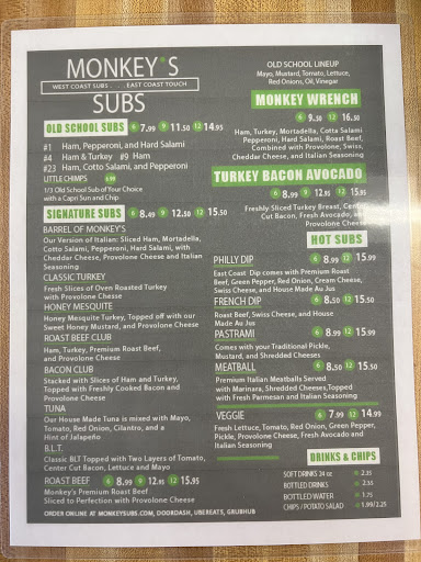 Read moreI am very disappointed! I have been a fan of Monkey's Subs since the beginning. I still remember my Number that was on the wall at the O.G. Subs. I have been ordering from Jersey Mike's lately because over the last few years our sandwiches have been wrong about 70% of the time. YES, my girlfriend orders a weird sandwich (BLT. No Bacon with tons of cheese), but it seems like you always screw up my sandwich (Barrel of Monkey add Pickle & Pepercini). It's not hard! It's a normal Barrel with the addition of Pickle and Pepercini. This day you forgot ALL the veggies, all the good stuff like mayo, mustard, oil, vinegar as well as the addition of pickles and pepercinis. Basically I got meat and bread with a tiny slice of cheese. I was all about the expansion but the quality is trash now. Bread always chewy like it's a day old. I NEVER get what we order. I am done with...