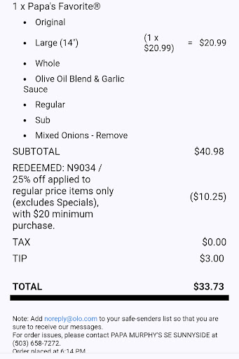 Read moreI have been going to Clackamas, OR Papa Murphy's location, since moving to the Clackamas area back in 2001. Some years I had gone more often, some years less. EVERY time I've gone PRIOR to today, this location has ALWAYS, without ANY issue, allowed me to redeem a coupon on the pizza, as well as one to get a free cheesy bread or cookie dough. Today, July 15, 2017, at a few minutes after 5PM, I walked in to order a pizza and cookie dough. The cashier stated he didn't believe he could accept both coupons. I stated, while it's been a while since I had last been here, I've always been allowed to do this without ANY issue for years. He then proceeds to ask the manager, Mike. Mike states, "We've NEVER allowed this." While Mike didn't explicitly call me a liar, the fact that he was VERY adamant that NEVER has it been allowed, yet I have successfully without fail, been able to do this some times 3x/week, sometimes once every 3-months... I took it as a attack on my character. If he were to have stated, "Sorry sir, while it MAY have been allowed in the past, it simply is not allowed now", OK, fair enough -- things change. But again, I viewed it as (a) him calling me a liar, and (b) ridiculous as again I've been able to do this forever!