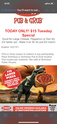 ย ย ย Read moreI had the best pizza I have had in years (yes, really, yes at Pizza Schmizza, yes I have the right place, no I'm not currently mentally unstable). I tried to get it again (the No Kiss Tonight) at another location, and it wasn't nearly as good, so I hope it wasn't just a fluke. We ordered a fresh whole pizza, and realized that when the by-the-slice pizza is pretty good, a fresh slice is going to be even better. Keep it up. You're the closest location to our house, and...