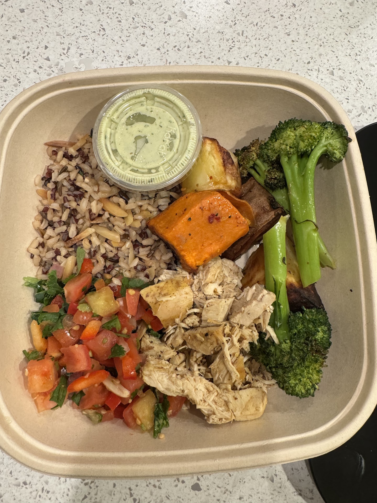 Now I've been here twice, each time getting something different: first, the Mediterranean bowl with chicken. I liked it well enough, but found it was lacking in flavor. Very salt and peppery, if you catch my drift, with a watery tahini dressing. Tropical smoothie was not bad, and the cheese breads were good! Overall, a decent experience but nothing great.