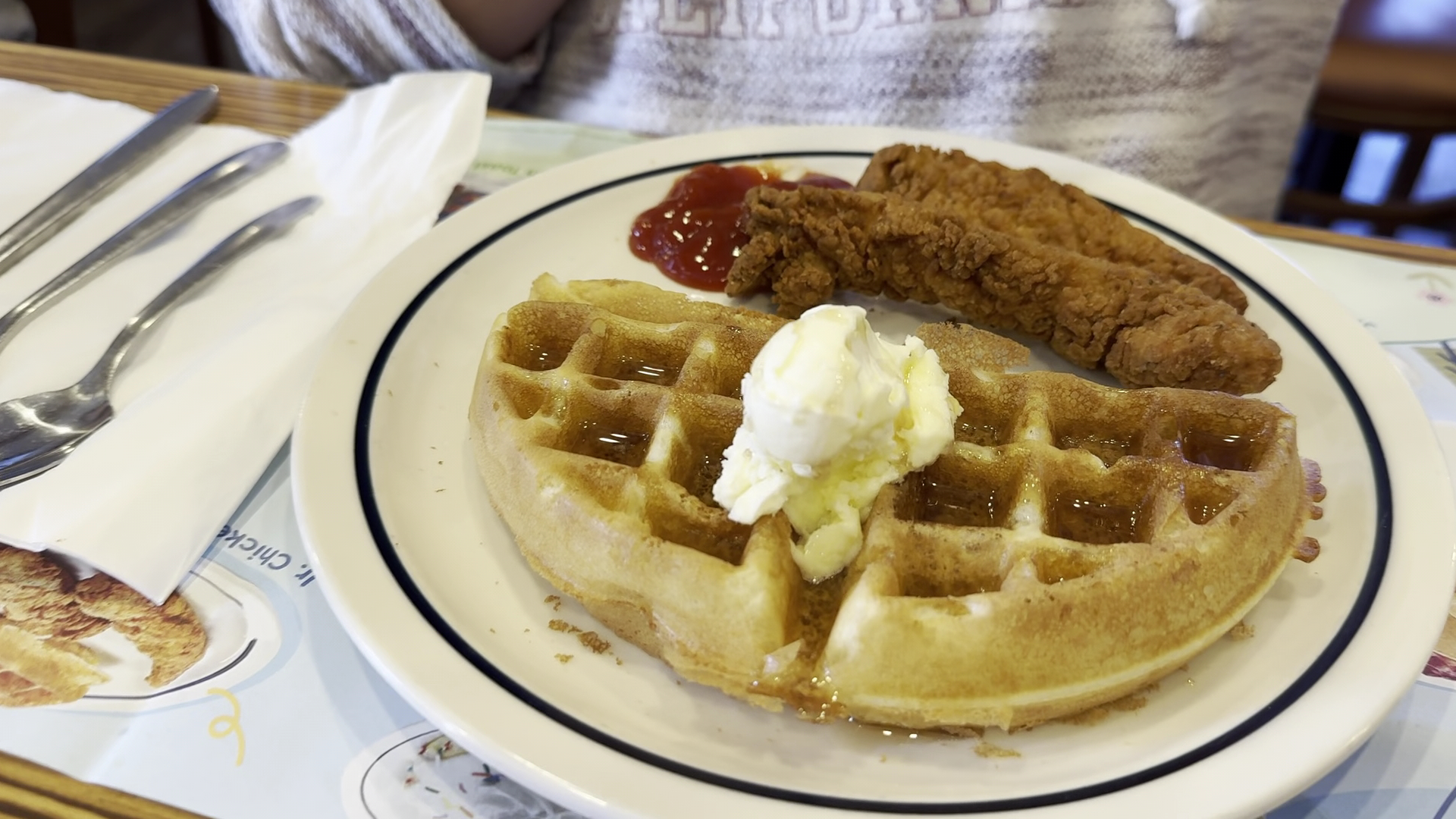 2023: We grabbed the wrong menu while waiting a long time in the lobby and our waitress didn’t make sure we had the right one so we didn’t see the steak and salmon options until as we left when we saw it in the window. We also paid $12.50 for our pancakes with strawberries on them and eggs and hashbrowns because our waitress didn’t bother to tell us that there was a “Rooty Tooty” special where we could have gotten the same thing for $7 if we had looked at the front window (or maybe the right menu). I told her I wish she had told me but she had no response. There is tons of red 40 in the strawberries I bet since the syrup they are in is bright red. We should have tried blueberry pancakes with blueberry topping. The eggs were yummy. The hashbrowns were cooked in rancid oil. The server never asked how our food was. She seemed annoyed that I was walking around the empty part of the restaurant to calm my baby while waiting for our food. The steak burger is just a hamburger and tasted ok. Fries were good. Pancakes were smaller than Denny’s. Left hungry. Should have ordered 3 meals for 2 adults...