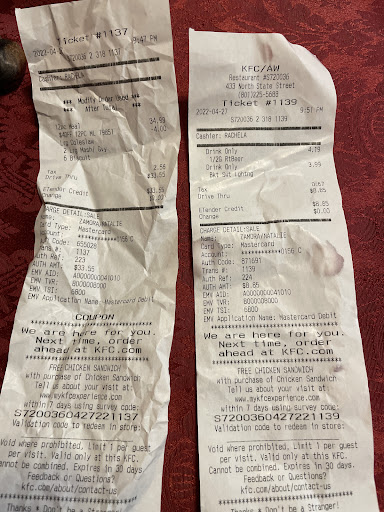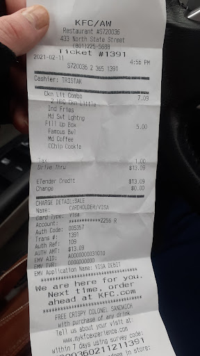 Ā Ā Ā Read moreIt has been a while since I have had such a poor experience at a fast food place. We were running behind schedule to get my daughter to school so I decided to get drive-thru so she could eat lunch in the car on the way. Horrible decision. I ordered two kids cheeseburger meals and a burger combo for me plus chicken tenders since there wasn't a kids chicken option. The ordering and payment process were pretty quick. I was asked though to pull out of line and wait for my order to be brought to me. I watched as 8-10 other cars went through and received orders and ours had yet to arrive. I mentioned that the reason we chose fast food was because we were in a hurry, well 10 minutes later and still no food. I called since I wasn't going to leave the kids in the car to check and was told we were waiting on fries. 5 minutes later and I am irritated, to say the least, but finally an employee comes out and moseys his way to us with one bag stuffed with our food. My order was wrong, the chicken order was wrong, kids meals were missing the treat and toy and everything was squished and soggy. I didn't have time to get it remade or dealt with then. I also didn't have proof of the wrong order because there was no receipt which is supposed to mean the order is free. I called again and given my options on how they could resolve my issues. None of which was truly acceptable but I had more important things to deal with so I hung out with an unsatisfactory fix. I haven't been to this A&W/KFC in a very long time and I will not return any time...