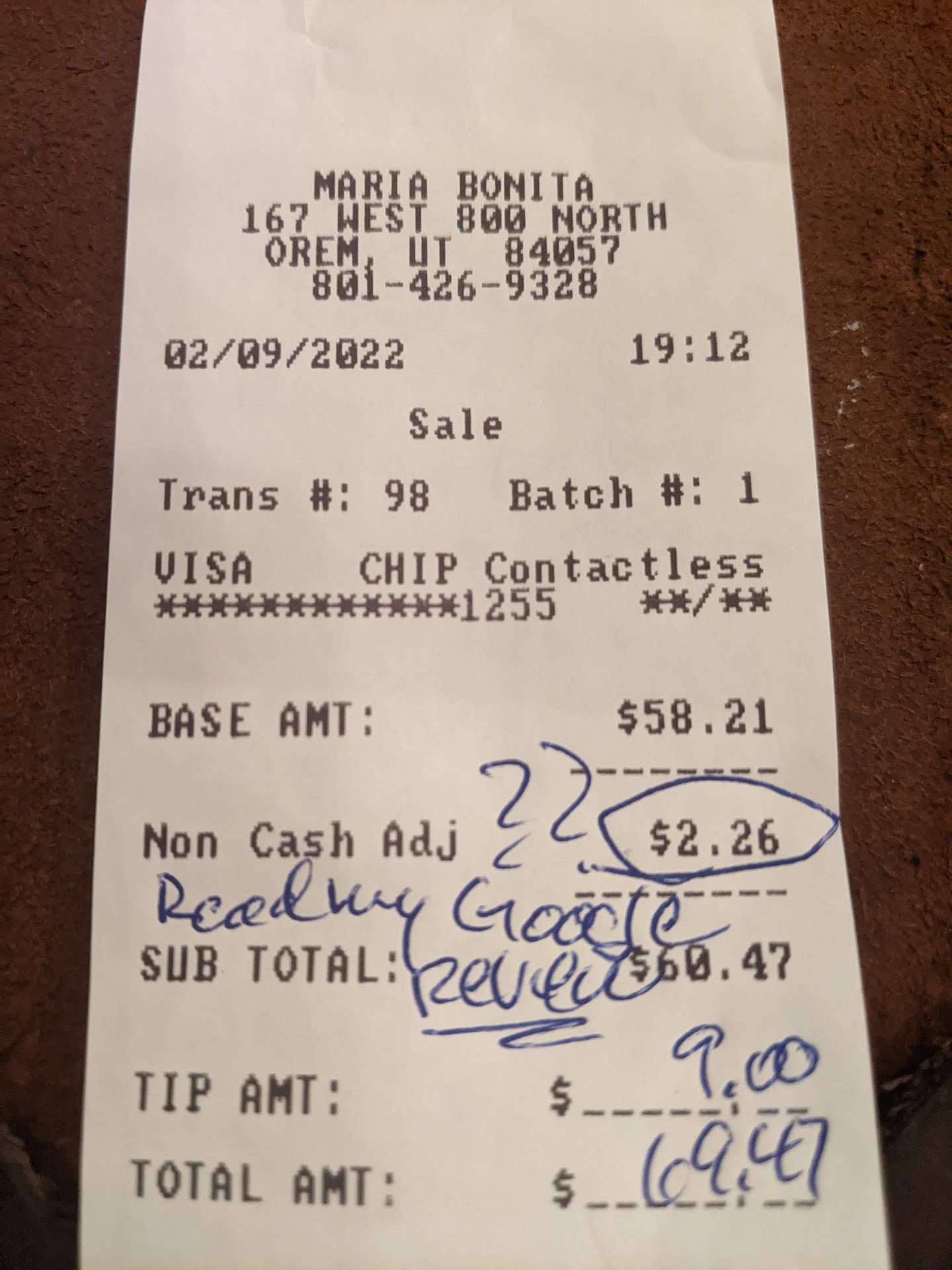 Read moreOur son picked Maria Bonita for his birthday dinner. It was busy at 5 pm and we had a 25 minute wait. We got seated and ordered in good time. Chips and salsa were great. Our meals came in good time except for one which happened to be for the birthday boy. 5 minutes after the other 5 plates had been delivered we asked a passing waitress how the last plate was coming. She checked and said it would be another minute or so. (Obviously missed!) We finally received our last dish and had a nice meal. Our bill was brought to us and we paid, leaving an 18% tip. We were then instructed, not asked, to leave as it was busy and people were waiting for our table. On our drive home we started doing the math and it seemed wrong. We looked at the receipt and noticed that we had been charged for 6 soft drinks. Only three of us had soft drinks and the other three had water. We were charged for two appetizers rather than one and the last dish which was late was double charged as well. I called Maria Bonita when we got home and explained the over charge to them. They calculated the over charges and stated that we could come get a gift card for the over charges. I asked them to just credit our debit card and was told they couldn’t do that. All they could do is give us for a credit on a future visit or we could come back and get a gift card. She stated the total to be credited/gift carded and the math didn’t seem quite right again. She didn’t subtract the 18% tip from the overpayment and stated that she couldn’t decrease the tip as that was the server’s earnings and she couldn’t touch that. I then noticed that I had also tipped 18% on the tax as well. I like to tip on service/food quality, not tax! I drove back to Maria Bonita from Springville and asked to be refunded for the overcharges and they held firm with the inability to refund. This was our first experience at Maria Bonita and I would not return except I have a $50 gift card that I need to use. I would rather spend that $50 at Joe Vera’s, La Casita or...