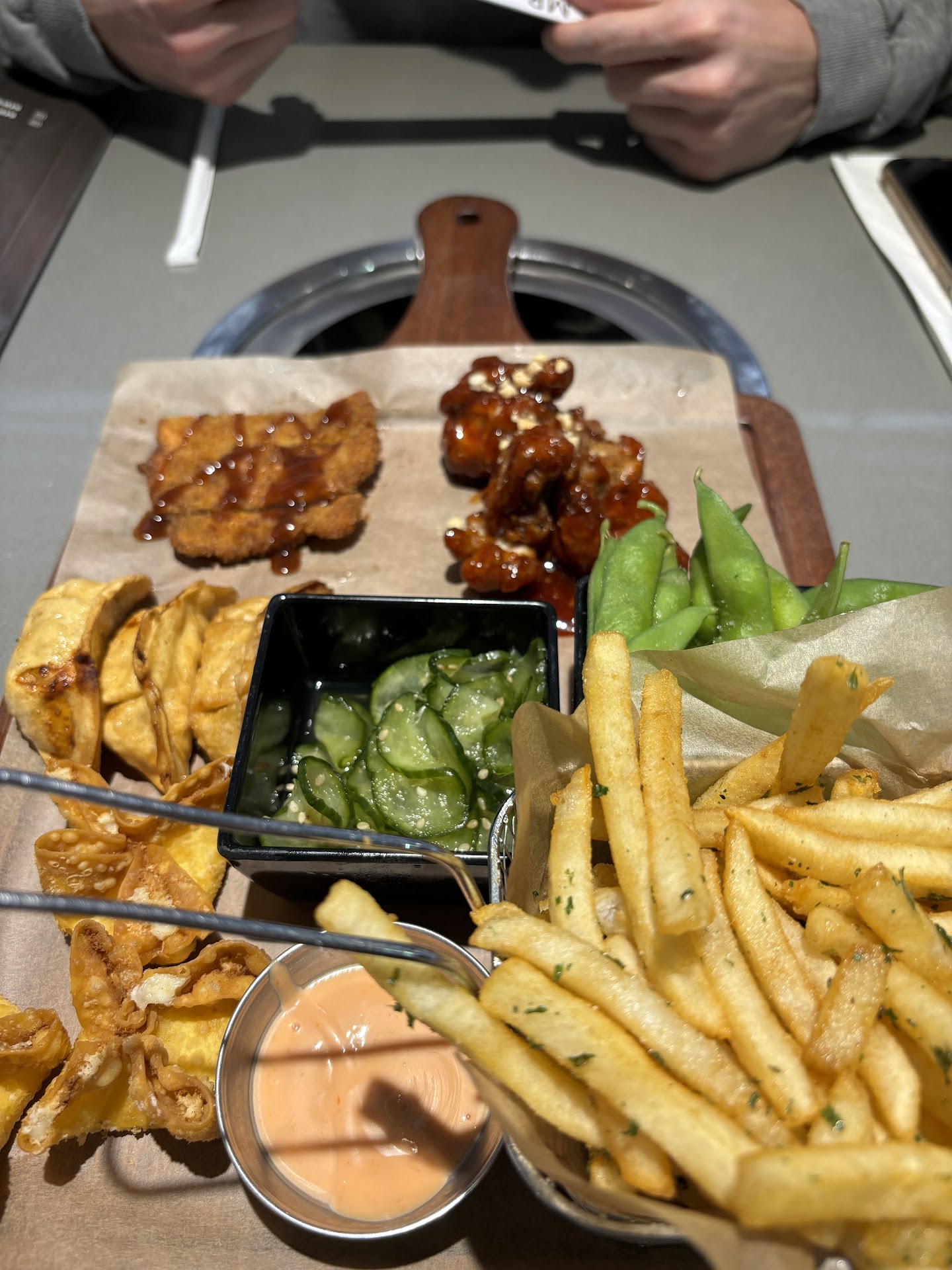 FOOD: The sushi could have been excellent, but it was way over-dressed—piles of tobiko I had to scrape off. I’m already not a fan of tobiko, but I’m okay with a small amount. The sauces drowned the roll to where you could not taste much else. Every roll we tried was like this: very mushy and swimming in the sauces. It would have been better to stick to their simple rolls, but we were also trying to get our money's worth. The appetizers were great. We got a sampler of all to try. We assumed a sampler would have small amounts, but we were given a lot of fries we had to finish. The Korean fried chicken was not great, cold and dry. But you can’t go wrong with the other appetizers.