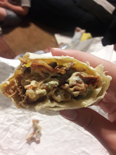 First of all, ew. Tiny burrito for 8 bucks. I got the smokehouse (shredded chicken, cheese, onion rings, bacon, ranch). Sounded promising. The first couple bites I was like "ok, pretty good". Then i got some chicken, which was SO dry, the edges were hard as plastic. They need to turn down the heat on the pan that's kept in, or have it sit in some juices to keep moist, because it was nasty. Then, I kept getting hard pieces, like leather i couldn't chew through. (Picture below). I tried to look over it and just pick it out, but on the third one, i gave up. I have no idea what it was, super hard bacon or chicken or onion? Barf. I seriously gagged. Probably a same issue with a hot pan. Didn't even get half way through my burrito.
