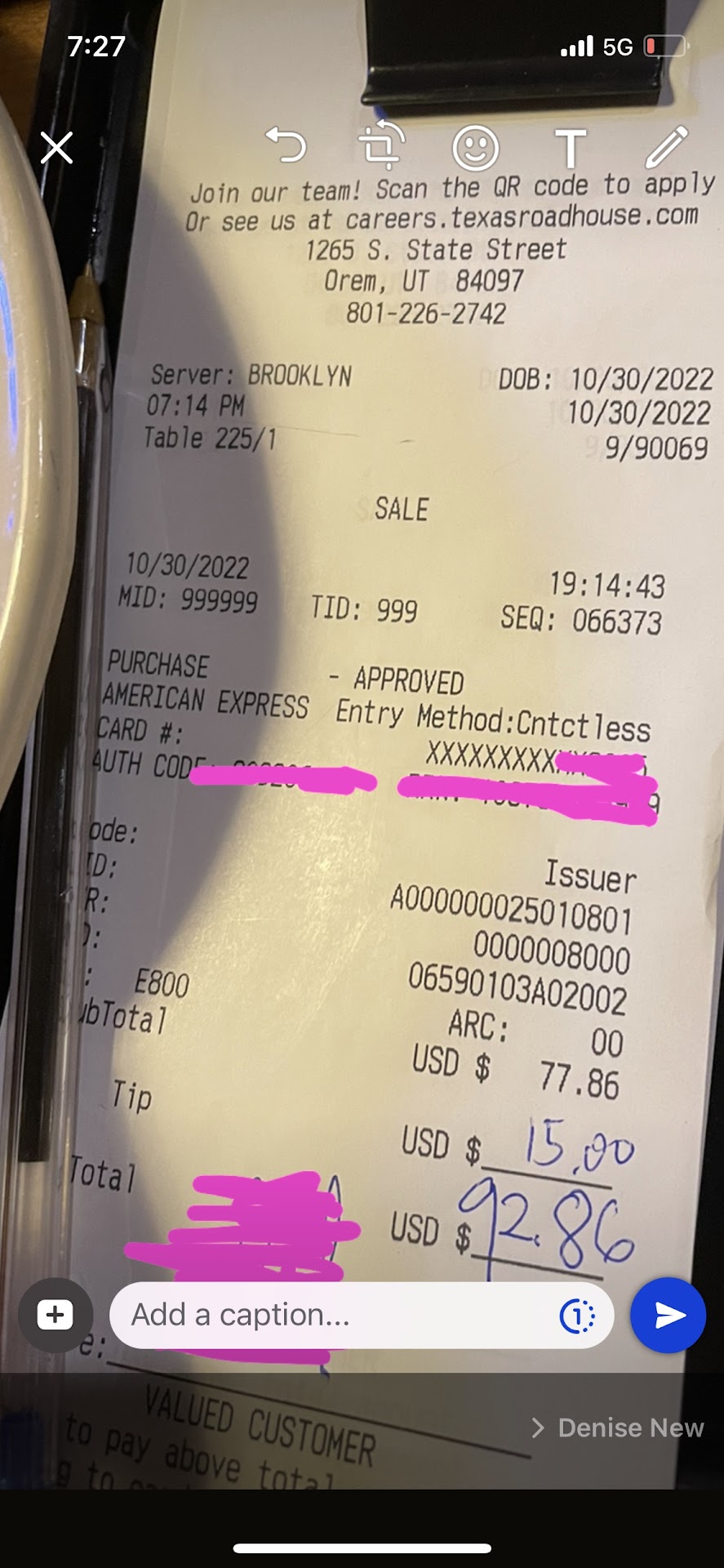 Read moreOur Server, Nikki, was FABOULOUS! Unfortunately, Nikki had to work 10-times harder because the bartender couldn't do their job. In addition, when my husband and I arrived, we must have hit a very popular time period. There were approximately a half a dozen parties that needed to be seated. The restaurant was over half empty, so the parties were being seated rather quickly - that is until it came to the very last couple which happened to be us. It would have been courteous for the front desk people to have prepared us for how long of a wait we should expect. Both my husband and I had to use their restroom as we initially walked in. While waiting to be seated, there was no less than four workers standing around the front desk just chatting - there were no new customers to sign-in to be seated. I noticed a large number of fresh bread baskets sitting under the heat lamp just behind the front desk. I leaned into my husbands hear and whispired, "someone isn't doing their job". FINALLY, my husband couldn't wait any longer and left to use their facilities. Immediately after he had left, the person called our name to be seated. That person was one of the individuals doing nothing but chatting at the front desk for at least 15 minutes while we were waiting to be seated. Toward the end of our meal, a female manager came to our table, introduced herself and asked how our service was. Again, we had nothing bad to say about our server at all, she was extremely pleasant and was working very hard to make our experience enjoyable. ALL of the SERVERS seemed to be working extremely hard at their jobs. Before leaving our table, the manager informed us that if we needed anything to just let her know. I Immediately informed her that all three women's bathroom stalls were out of potty protectors. She did appear to be surprised and concerned that all three stalls did not have any protectors available. After finishing our meal and paying our bill (probably a good 15 minutes), I went to the restroom, again, looking forward to seeing potty protectors in the stalls. Well, there was still none so I guess the manager really wasn't that concerned about that issue. If I worked at this Orem Texas Roadhouse Restaurant and a customer made a complaint directly to me, I would have taken it upon myself to resolve the issue immediately instead of introducing myself to customers sitting at tables enjoying their meal and asking how their Servers treated us. Yes, I understand there may have been a valid explanation as to why this manager couldn't refil the empty potty protector holders herself, but if the reason was something like the restaurant didn't have any supplies, then they have bigger issues to resolve.
