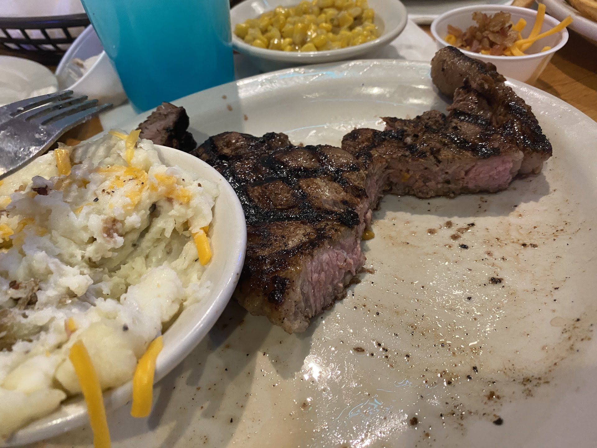 The second experience was almost a mirror image of the first. We arrived and were sat at a small 2 top. Several tables were opened while we sat there waiting for our server. Our server came about 20 minutes later and was very blunt. He never brought us rolls so we asked another server which we hate to do but then had to ask another server again for refills. Shortly after runners had brought out our food he dropped the check off at our table. We had only taken the first few bites. He never checked to see how the food tasted or to offer desserts. While we had sat waiting I watched the other servers open tables(I have been in the restaurant industry for years and like observing and learning) and there were two tables that were opened that I want to mention just in case. Let me preface that I am not sure if there is a different ID checkpoint or system of checking IDS for Texas Roadhouse. The first table was quite young and I would have ID'd every person on the table not one person was checked and they were all served alcohol which would have made me very nervous as I would not want any fines or penalties. Then a second table who looked to be in their 30's with a different server also never checked any ID's and served them alcohol. It did seem a little safer but again I am not one to risk it. There was also no water brought out with the drinks which again could be based off their alcohol license requirements. (On my most recent visit no one around us had ordered so I couldnt see if things had changed, things that had changed though were the front door got fixed and it appeared some new signage for IDing was put up) Our food was actually all quite delicious and cooked to their proper temperatures the only complaint was that there was sour cream on my mashed potatoes when I had asked for no sour cream. Service was definitely a 1/5 but food was probably still a 5/5.