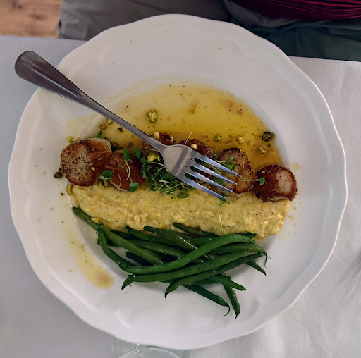 None of that would mean anything without the food, though. And the food was absolute perfection. At our server’s suggestion, we started with a tomato and crab bisque. Amazing! My husband went on to enjoy the pistachio crusted scallops, served over polenta with green beans. I ordered an excellent salmon with dill sauce, accompanied by a boiled potato (I know that sounds a little meh, but wow! Fabulous!) and green beans. Everything was prepared perfectly, and tasted delicious.