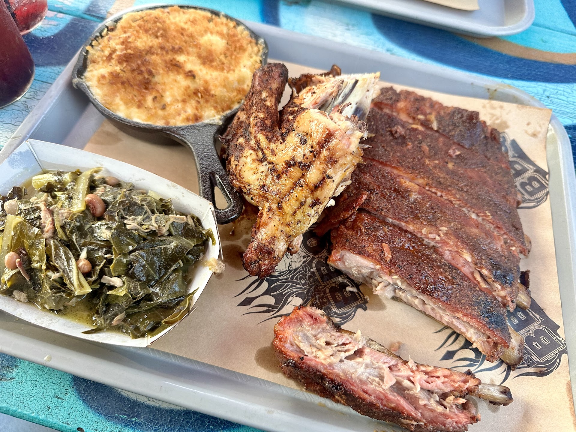 All of this and I haven’t even mentioned the food yet! The meat rub was good. I liked the peppery flavor. The chicken was moist. The ribs literally fell off the bone. The Mac and cheese was creamy. The greens were perfect. The black eyed peas in them were a nice touch. The sauces were nice. We bought two of them to take home (321 & Spicy). Everything was good.