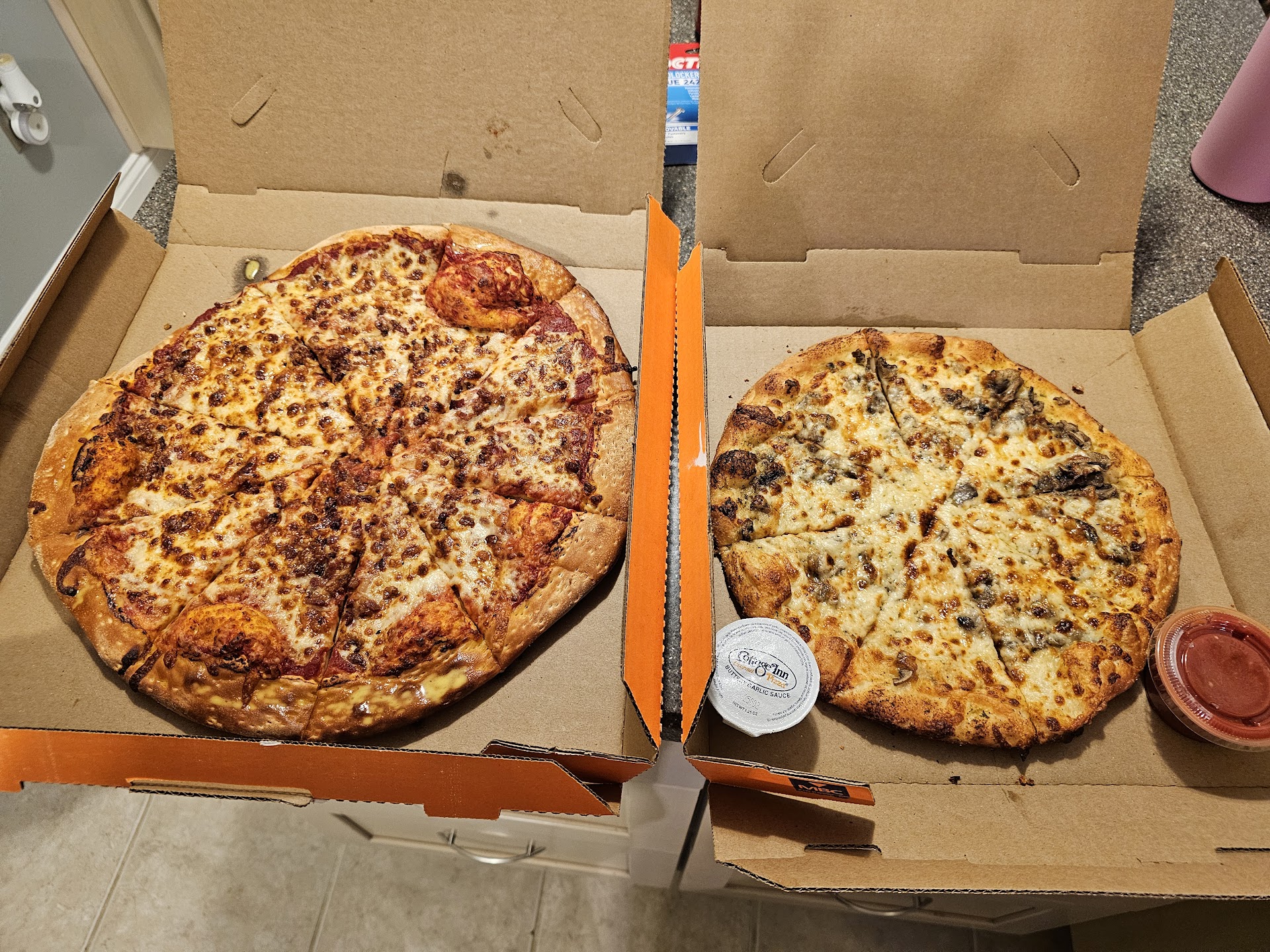 Pizza 1 I ordered a medium with pep, mush, extra sauce and garlic cheese crust. My pizza did not have the garlic cheese crust. The toppings level was good for the pepperoni, but lacking for the mushrooms. The crust was not great, being quite cardboardy. The cheese was thick, but a bit greasy.