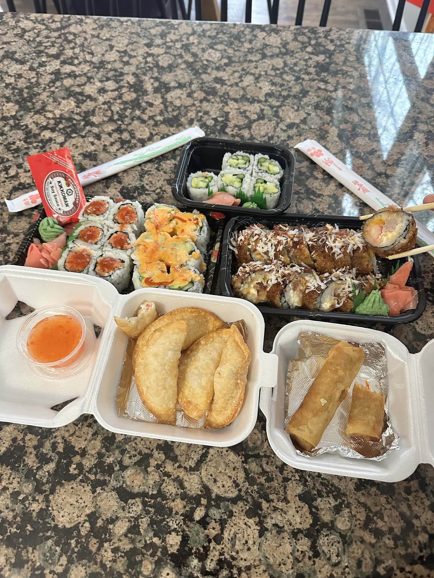 Here is a picture of what Katie and I got! Katie got a Spicy Tuna roll and the AAC roll, and I got the Spicy California roll and their specialty Coconut roll. All four were delicious! We also got their Crab Wontons (I love crab Rangoon and have only had the four sided folded ones before, this was the first time I had them in this pocket-like form and it’s my new favorite!) and they were so airy and fresh tasting. They also gave us a complimentary order of Spring Rolls (also amazing) which was totally unexpected, and very much appreciated!