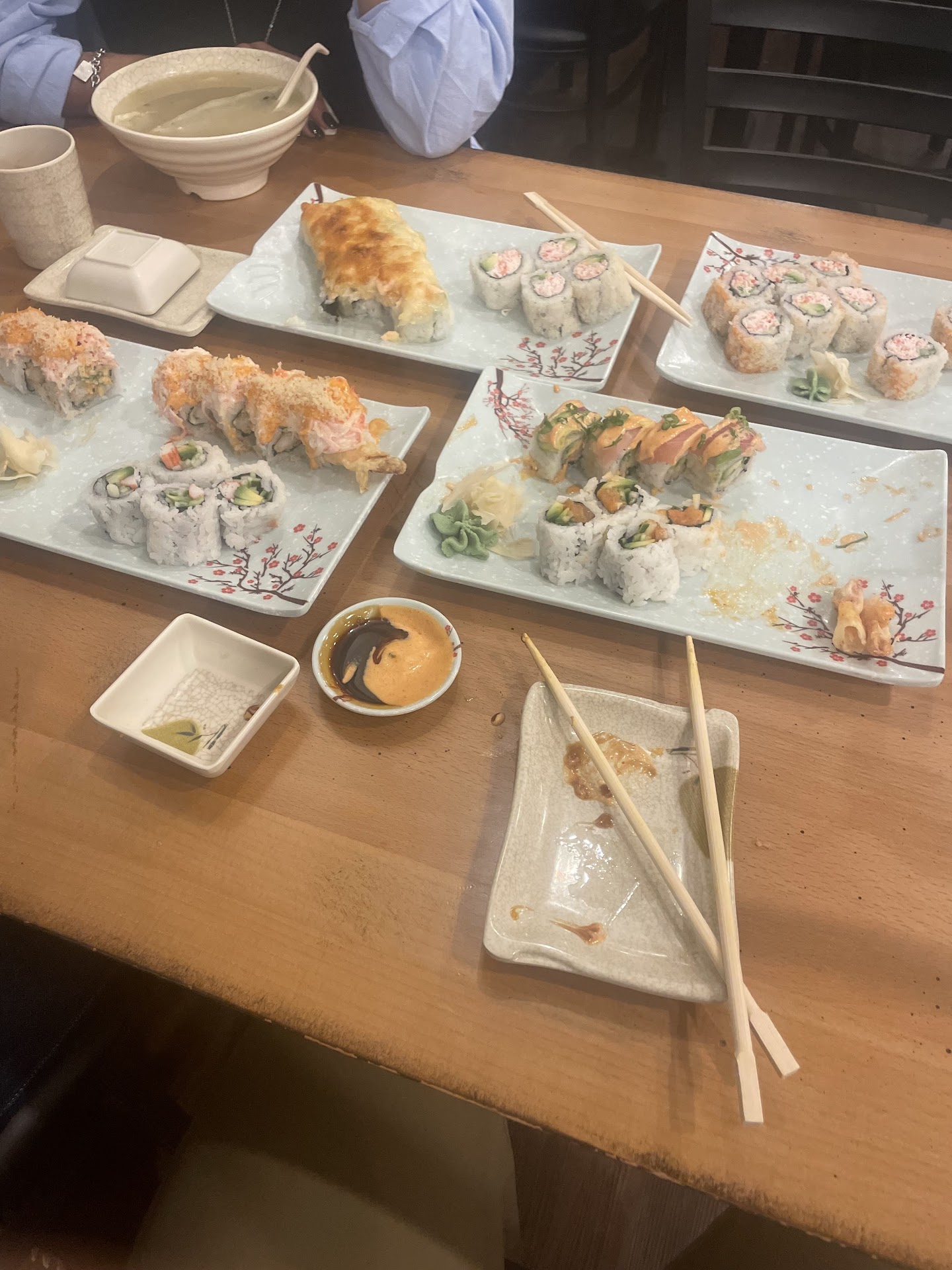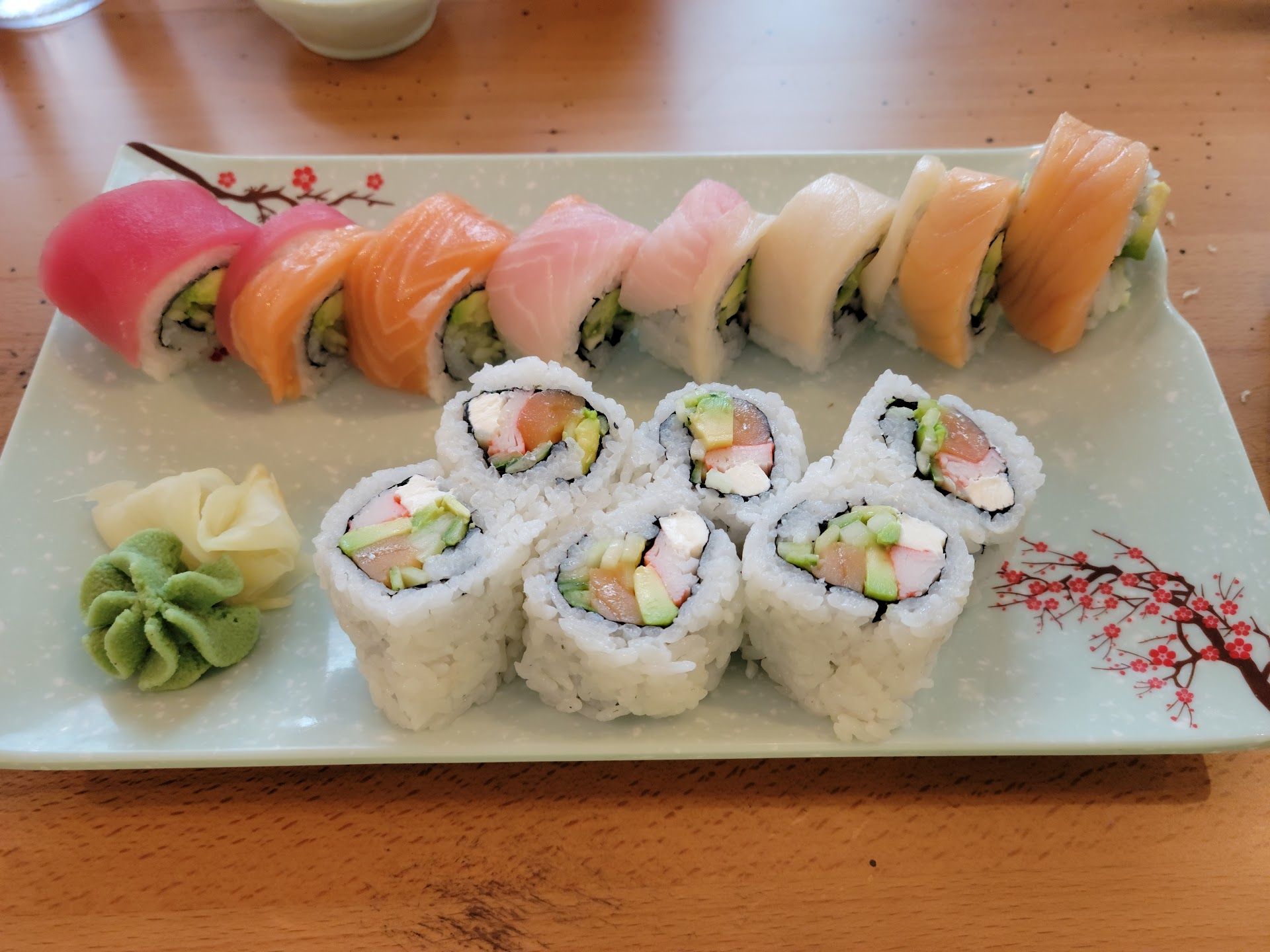 I ordered the Philadelphia sushi roll, which had smoked salmon, imitation crab meat, avocado, cucumber, and cream cheese. I also ordered the Gemini roll, which had imitation crab meat, avocado, and cucumber. On top of the rolls were either tuna, smoked salmon, or red snapper that gave the rolls a cool rainbow effect. The presentation of the rolls were beautiful! Both rolls were very good and were a good portion size. Our waitress told us that for future orders, we can substitute the rice for cucumber for a few dollars extra.