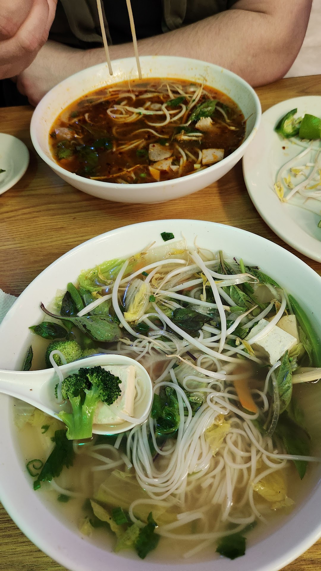 Read moreMy partner and I are both foodies, we love checking out any and all restaurants and we are both so glad we went here. As soon as we had walked in we could tell it was a relaxed atmosphere. There was music from YouTube being played on a TV, everyone eating looked satisfied. With the fun paintings, twinkling lights, and plant vines hanging across the windows the atmosphere felt lived in and homie. I have a shellfish allergy, which usually can be a problem at asian restaurants. But our server/I believe the owner was incredibly kind. I am lucky usually if servers know which foods are cooked in the same oils so I tend to feel a bit anxious eating. As soon as I told him of my allergy he told me that I could order anything I want on the menu. That he would make sure to make any replacement and that I would be safe there. He had conversations with us about choices he made with the restaurant, he was incredibly kind when we were leaving. Even packing the food for us and offering us drinks to go. I can't remember the last time we had service this nice. My partner and I were so relaxed there, he got some lovely ginger tea and I got a mango smoothie made with real mango! Both of them were incredible. I got the vegetarian phu with chicken broth. I usually am adverse to the taste of unseasoned vegetables, but after a few bites I realized how incredibly refreshing it was. I had an upset stomach going there and by the time I had left it had calmed down significantly. We are upset that we have only just found this place before moving. Don't make the same mistake as us and wait to...