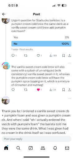 I ordered online from here, trying to make my day better, a drink with no ice and I used my points so it was free. They gave me it half full then the guy said he could add more milk and, although thatâs not what I wanted, I said sure. I guess his manager said he couldnât cause he would have to charge me. But if I wouldâve asked for extra milk online it wouldâve been free like all of the other add ins so why not just add some more milk and move on with our days. At tropical smoothie if your cup isnât full we make more smoothie to fill it and we donât charge you. If I ask what size something is, you show me the cup and I order it, I expect it to be filled to the top, some places itâs spilling out. Like, is it really that serious, whatever thanks for nothing. Oh yeah and my croissant that I did ask to be...