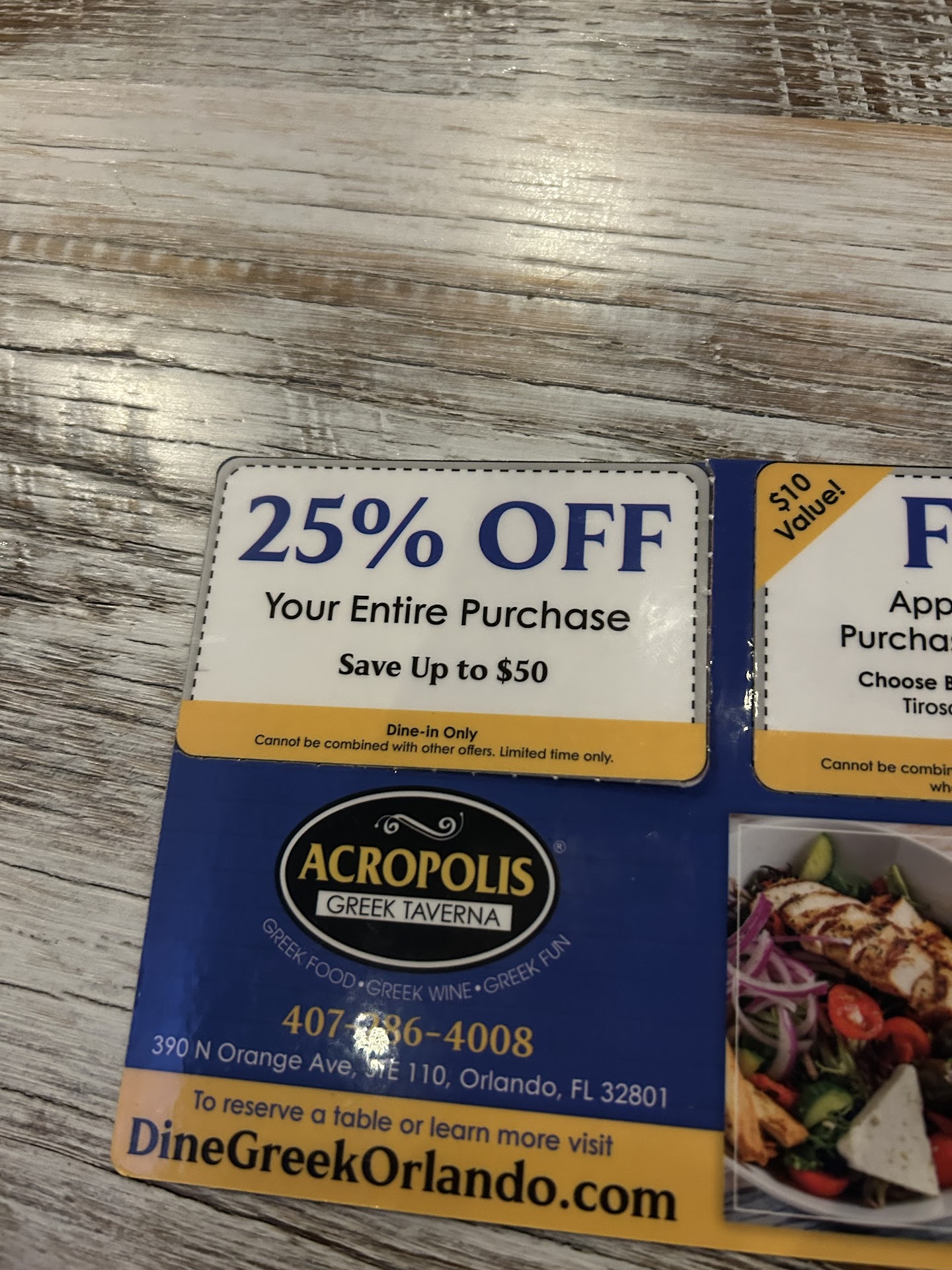 Read moreTucked downtown with a convenient parking right next to the restaurant. We were seated at the bar and while the bar stools were super comfortable the service lacked urgency and timeliness. We were greeted warmly by Noelle and The menus were provided promptly. We ordered the appetizer sampler - a must try - the hummus is creamy and tasty, the tzatziki is delicious and the feta cheese dip is out of this world. The ouzo mussels are absolutely amazing and I finished every single one of them and dipped the sauce dry. The honey cake - YES! The main course though was a total disappointment - we had the lamb lollipops - medium - some were overdone, some were rare, they were chewy and overall inedible. The NY strip kebob - same thing - too rare and chewy. My dish was exchanged for the chicken Rhodes - which was better. However, I was charged for both dishes even though I took one bite of the lamb lollipops and returned it right away. The drinks came late when we were in the middle of the main course and our waters were never refilled. There were just three other couples sitting at the bar so not being able to order drinks or to get water when it wasn't even busy was a bit weird. The kitchen manager TJ came out to apologize for the unfortunate dishes and when I alerted him about the extra charge he mentioned that they will take it off. However the bartender was nowhere in sight and we waited over 20 minutes for us after the checks were presented and we still couldn't get someone to help us get it right. We ended up leaving in the end with the check still wrong and determined not to come back. To think we went to Acropolis so I can introduce my friend to Greek cuisine... and to have this experience - it was a disaster...and she...